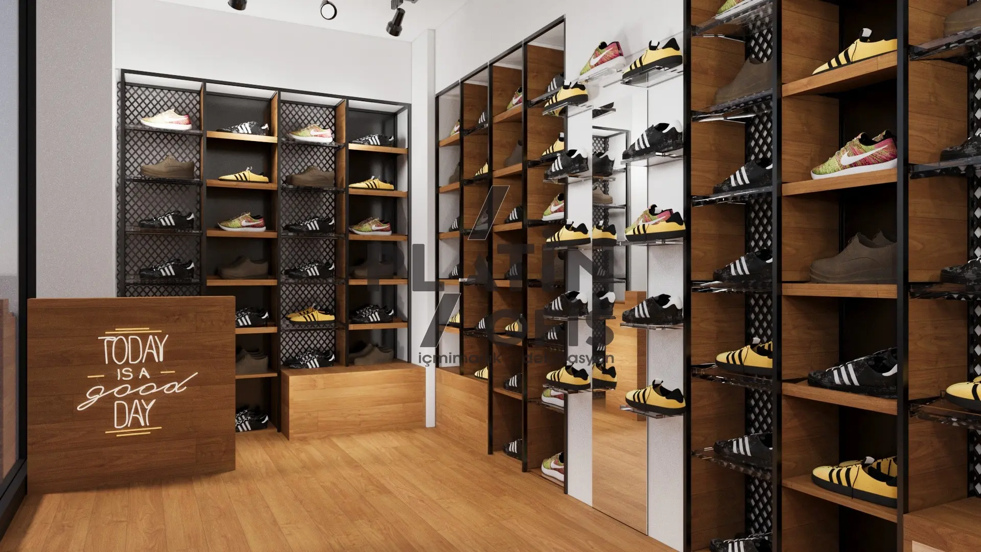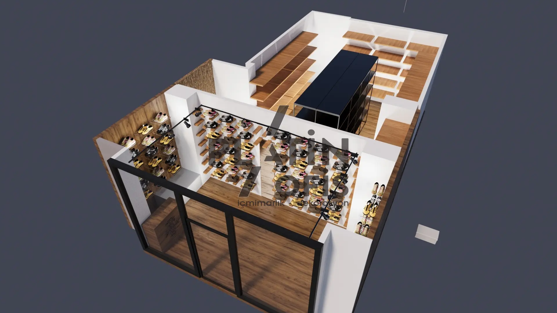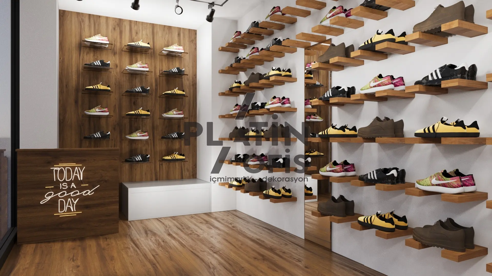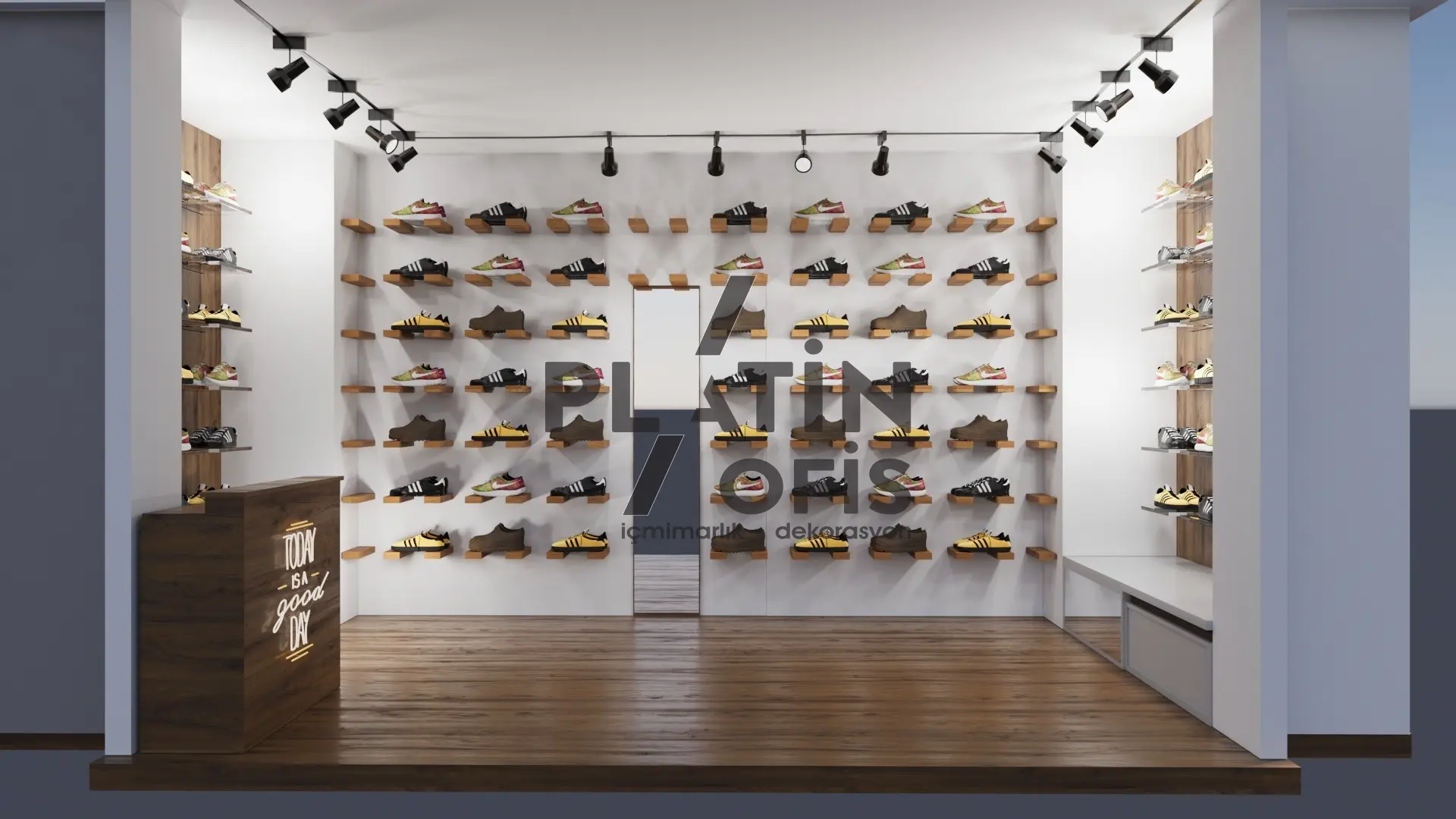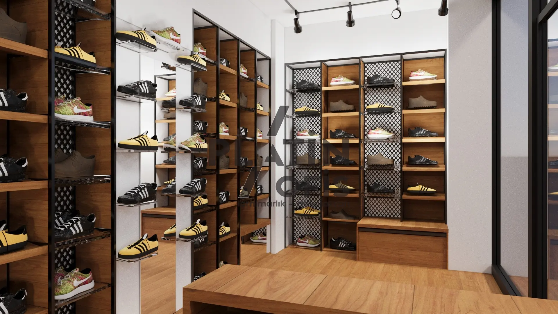 Ayakkabıcı showroom iç mimari tasarımı, Platin Ofis’in perakende deneyimini artıran akış planı, doğru aydınlatma ve modüler sergileme çözümleriyle kurgulandı. Ziyaretçiyi girişte karşılayan vitrin hattı, ürün hikâyesini adım adım anlatıyor.