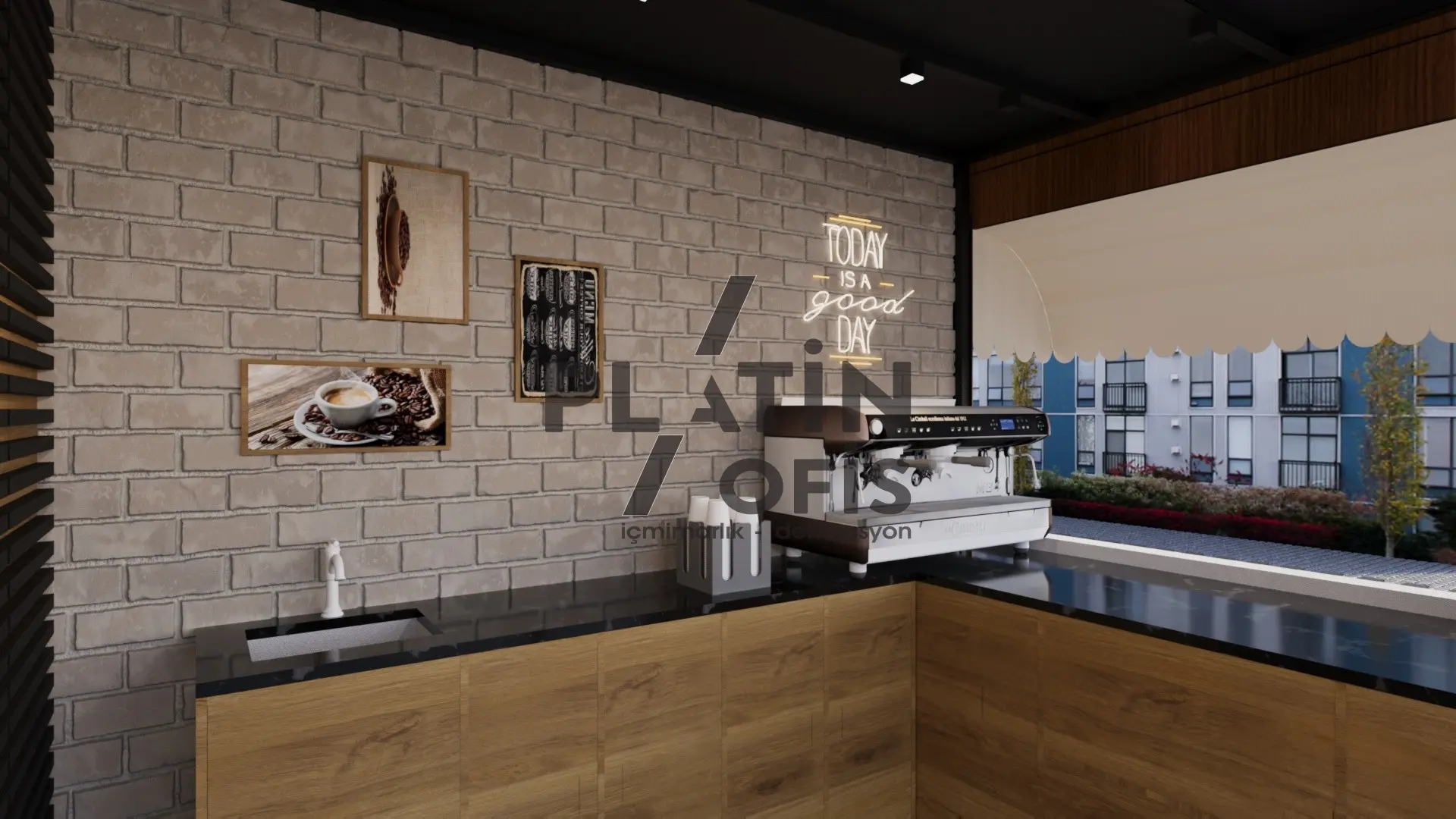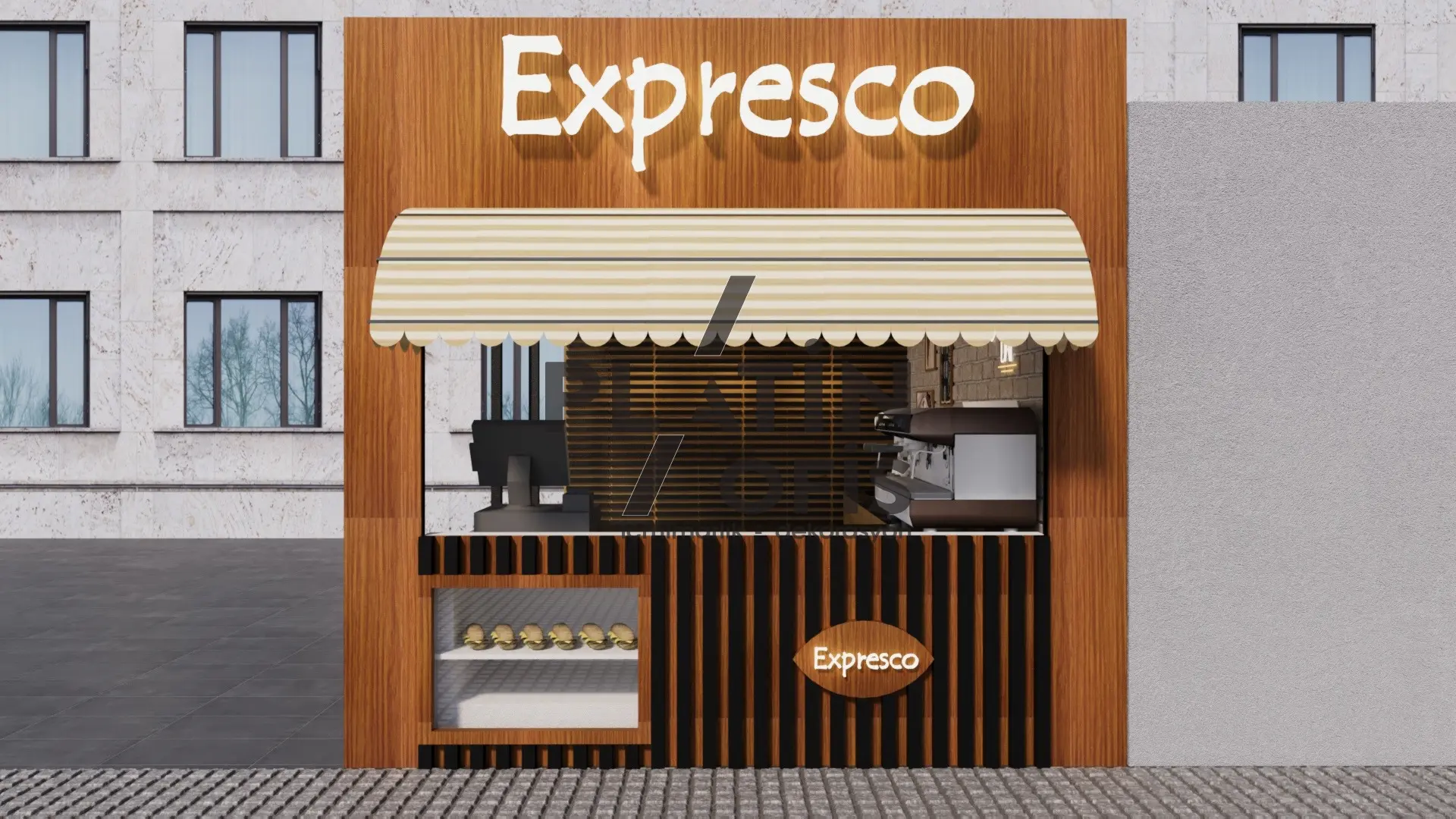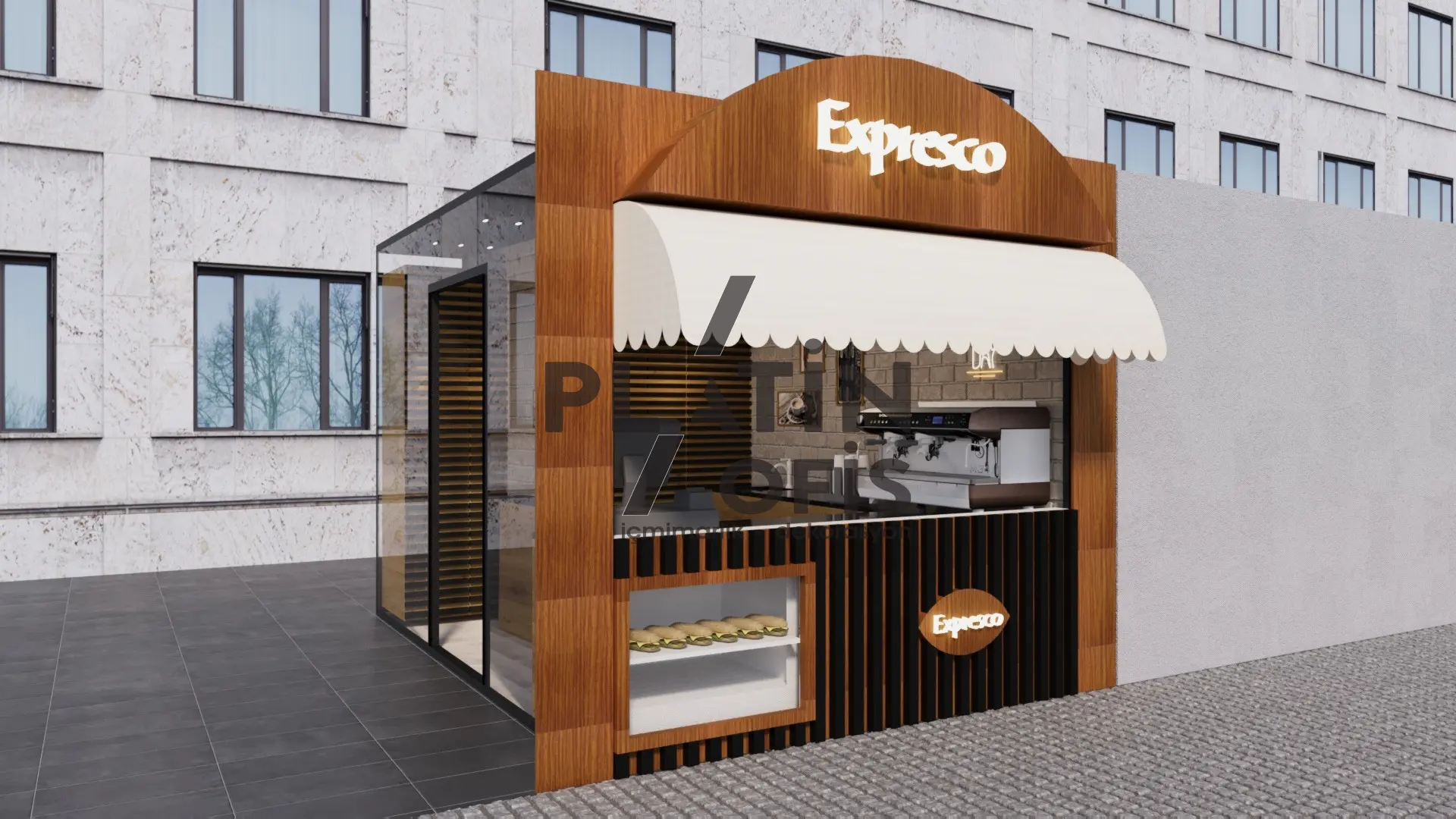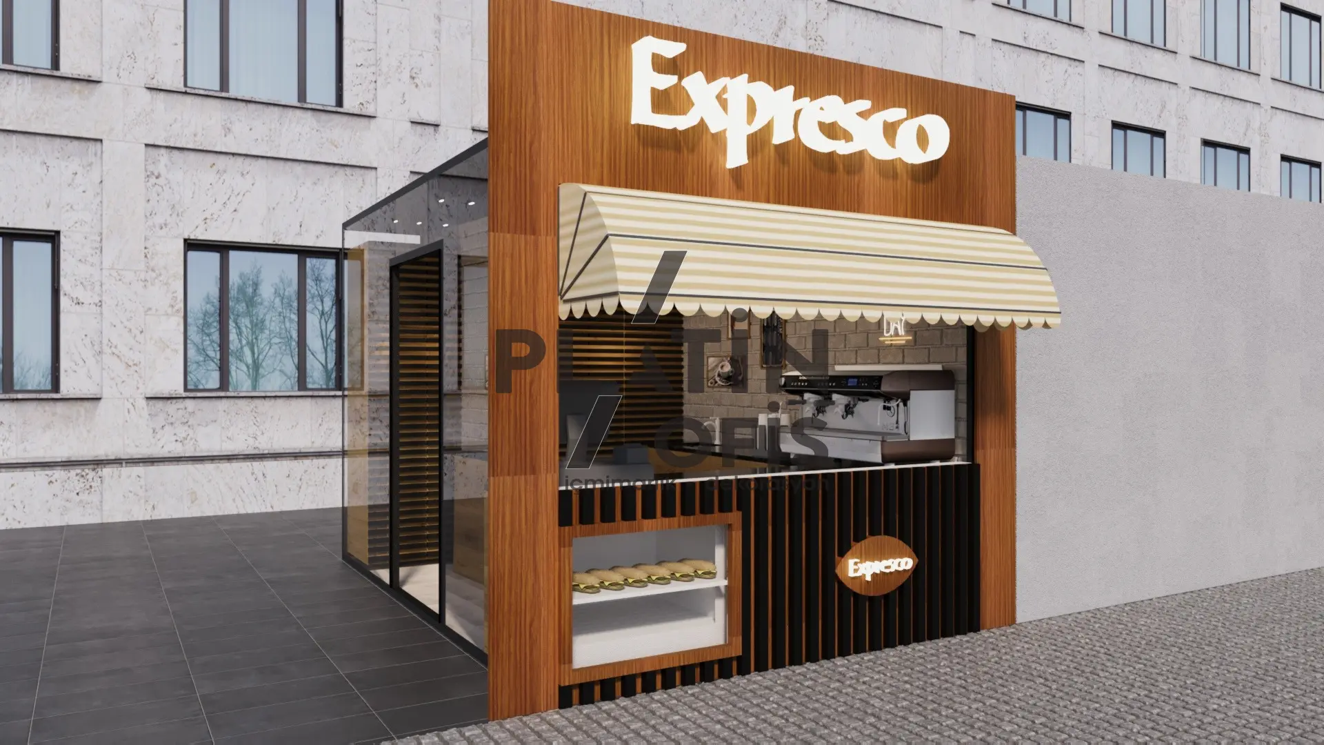 Expresco take away kahve standı projesinde dış cephe, ahşap dokulu lamel kaplamalar ve nostaljik çizgili tente ile samimi bir sokak kafe atmosferi yaratır. İç mekânda beyaz tuğla duvar kaplaması, profesyonel espresso ekipmanları ve ahşap tezgah detayları, kompakt alanda maksimum işlevsellik sağlarken marka kimliğini güçlü biçimde yansıtan modern bir mobil kafe konsepti ortaya koyar.