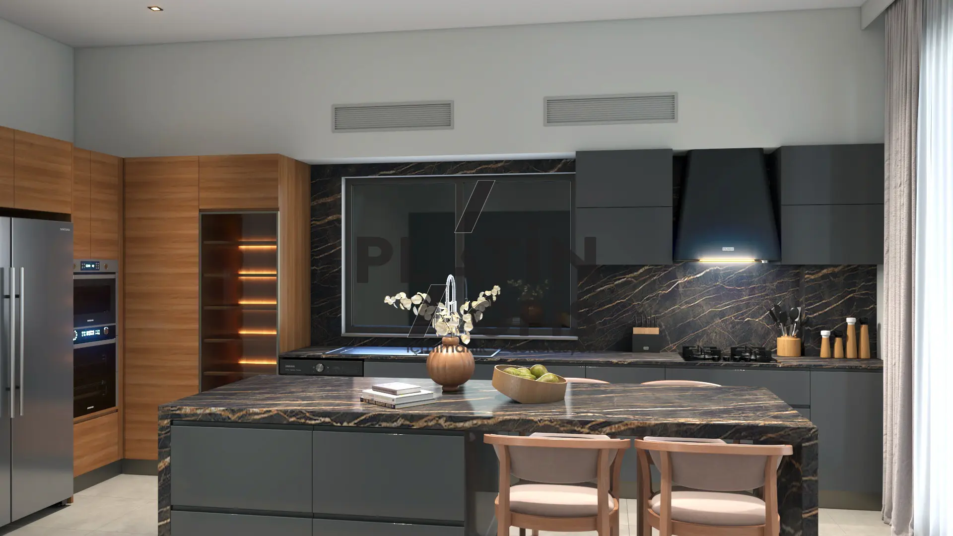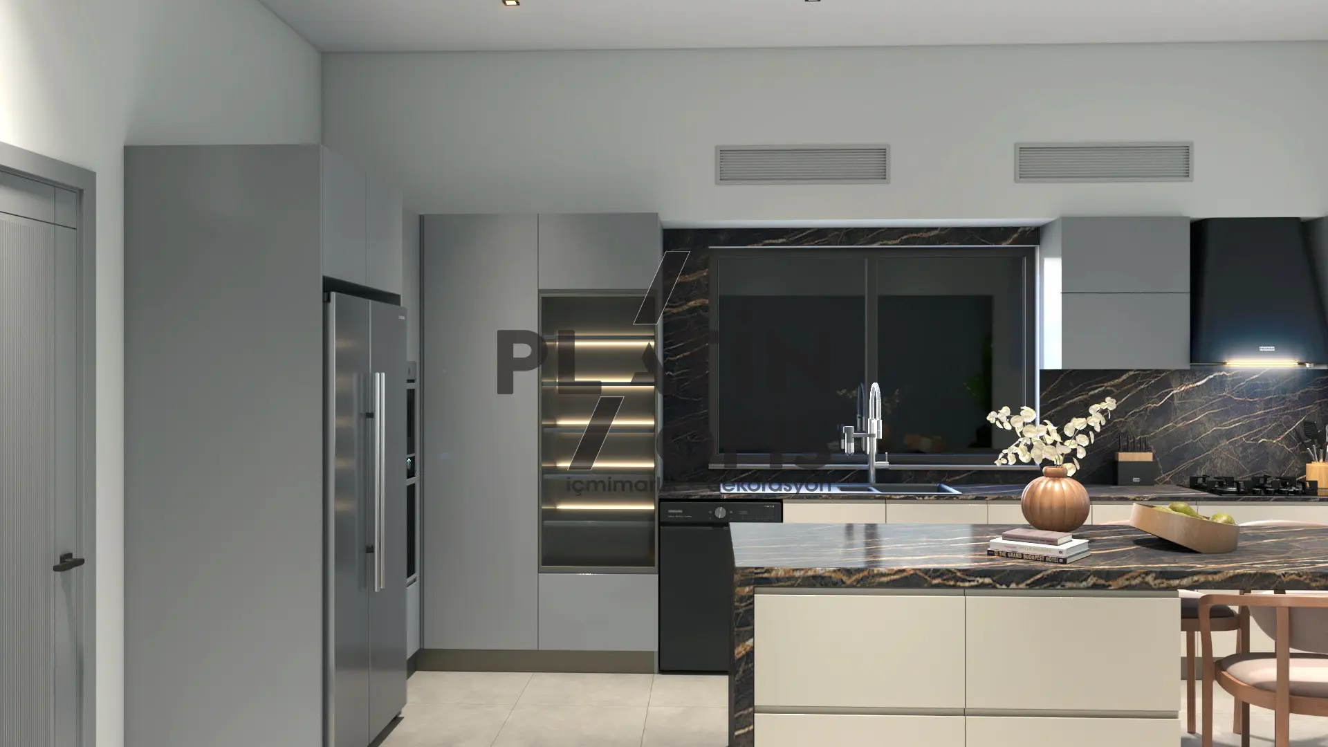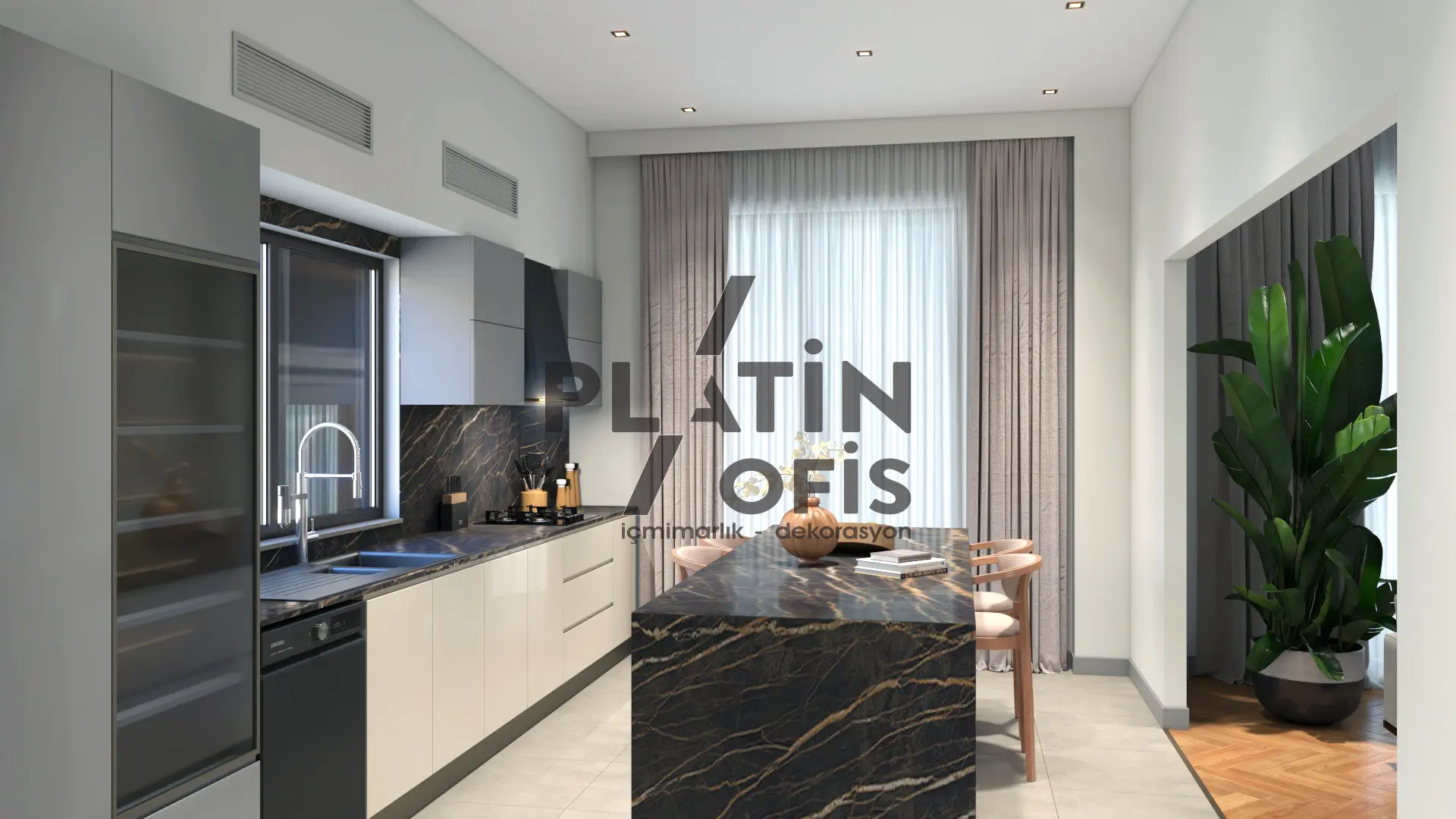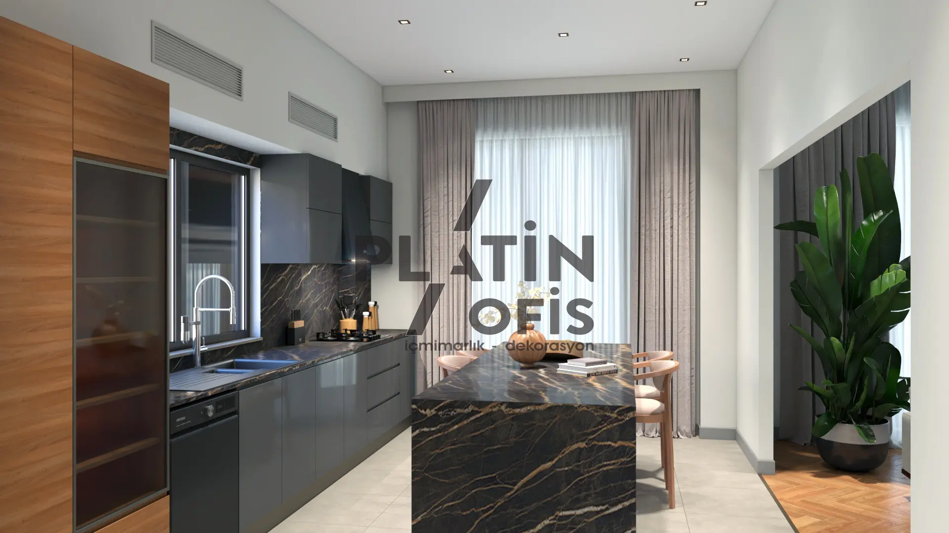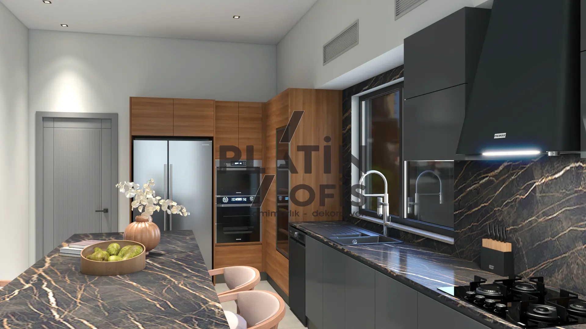 Milenyum Park villa mutfak projesinde altın damarlı siyah mermer tezgah ve duvar kaplamaları lüks bir atmosfer yaratır. LED şeritli açık raf sistemleri, ceviz kaplama ve mat gri dolap alternatifleri, ankastre premium beyaz eşyalar ve ada mutfak uygulamasıyla modern bir yaşam alanı oluşturulurken, gizli klima sistemleri ve şık bar sandalyeleriyle işlevsellik ve estetik mükemmel bir dengede buluşturulmuştur.