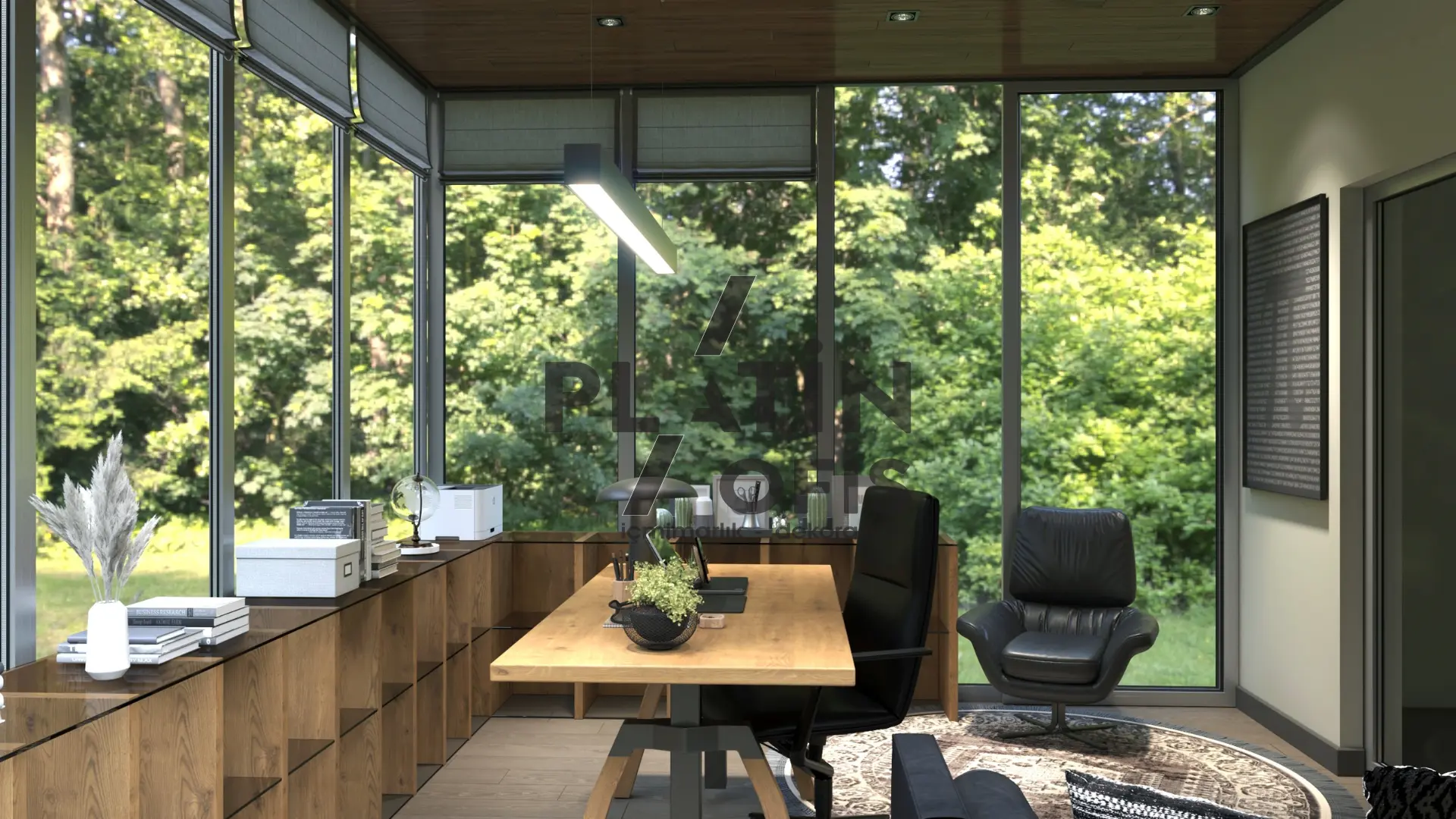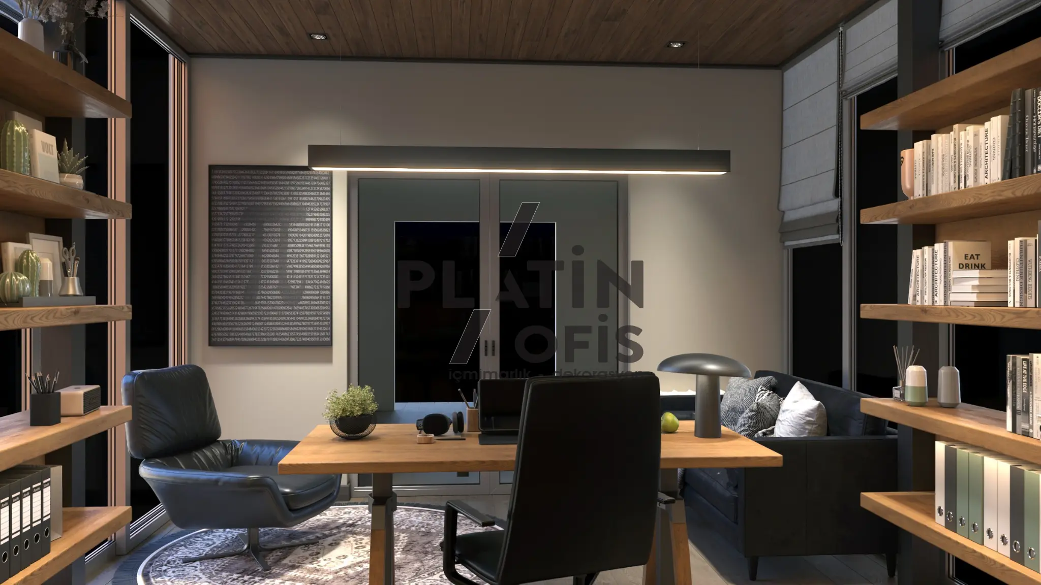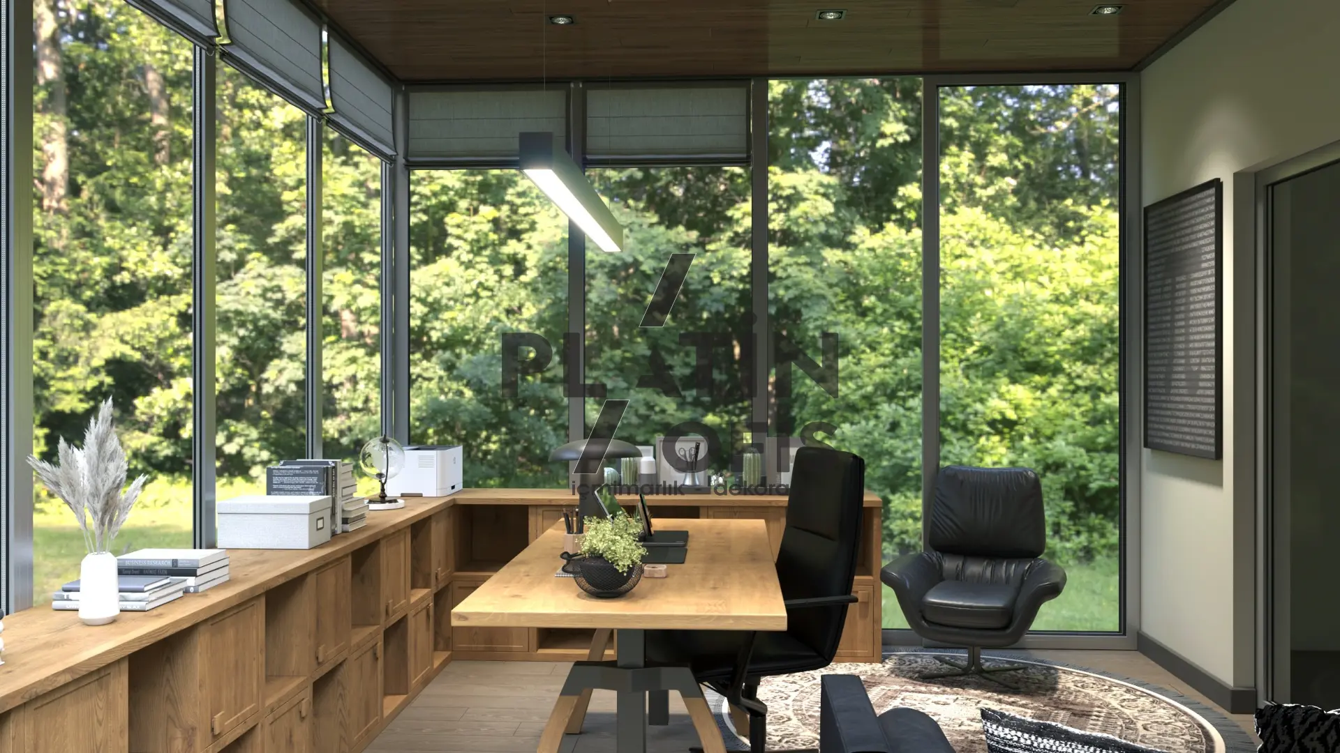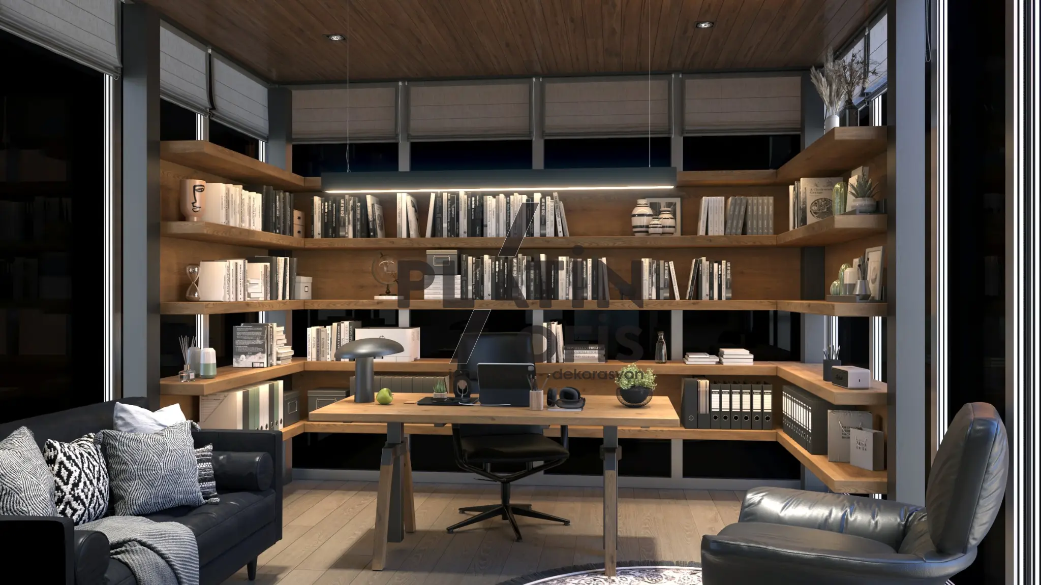 Milenyum Park Villa yetişkin çalışma odası tasarımı projesinde doğal ahşap mobilyalar, geniş panoramik pencereler ve ahşap tavan kaplamaları kullanılarak orman manzarasıyla bütünleşen huzurlu bir çalışma ortamı yaratılmıştır. LED aydınlatmalı açık raf sistemi, masif ahşap L tipi çalışma masası ve siyah deri oturma grubu ile fonksiyonellik ve estetik bir araya getirilmiştir. Modern asma aydınlatmalar, ergonomik mobilyalar ve geniş depolama alanları hem gündüz hem gece kullanımda maksimum verimlilik sağlayarak villanın prestijli ve konforlu bir home office alanına dönüşmesini sağlamıştır.