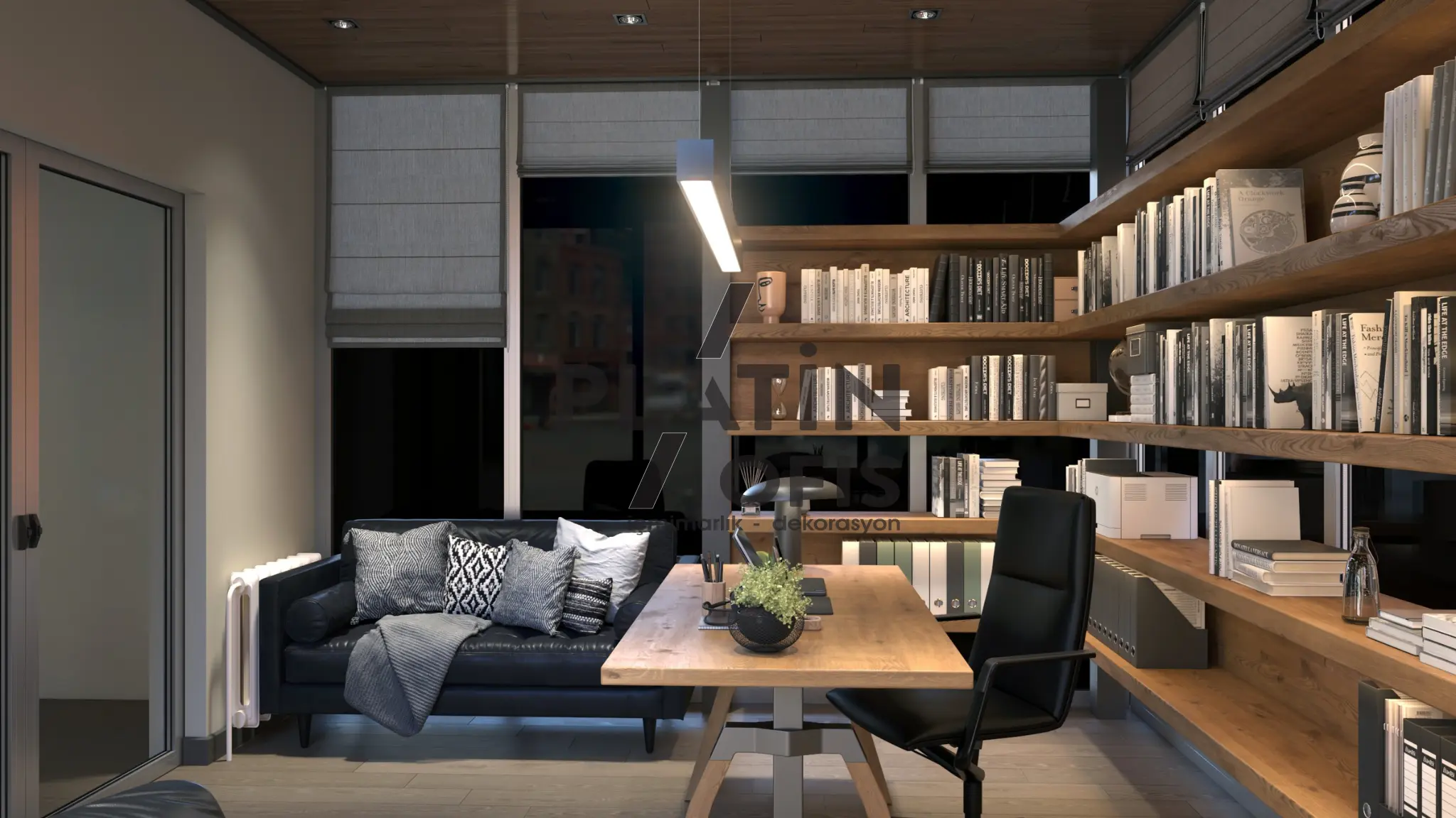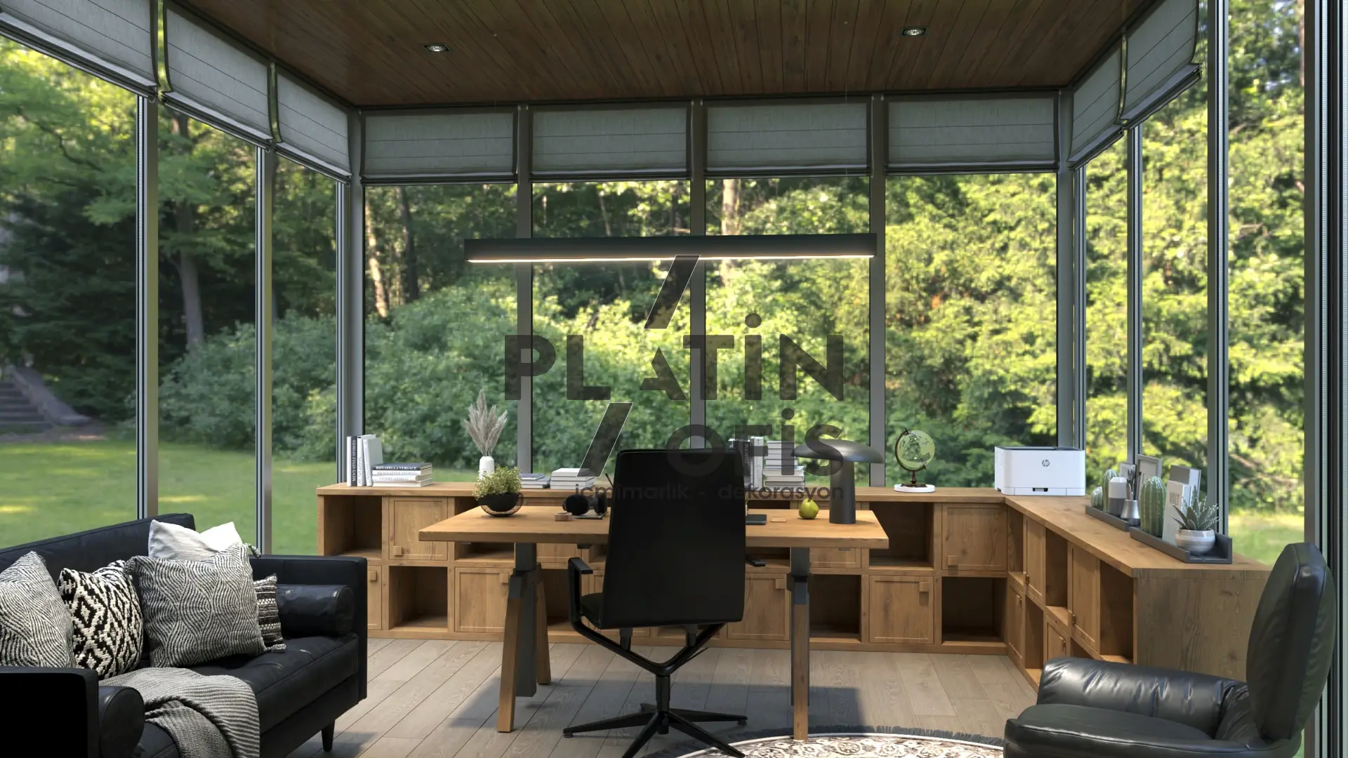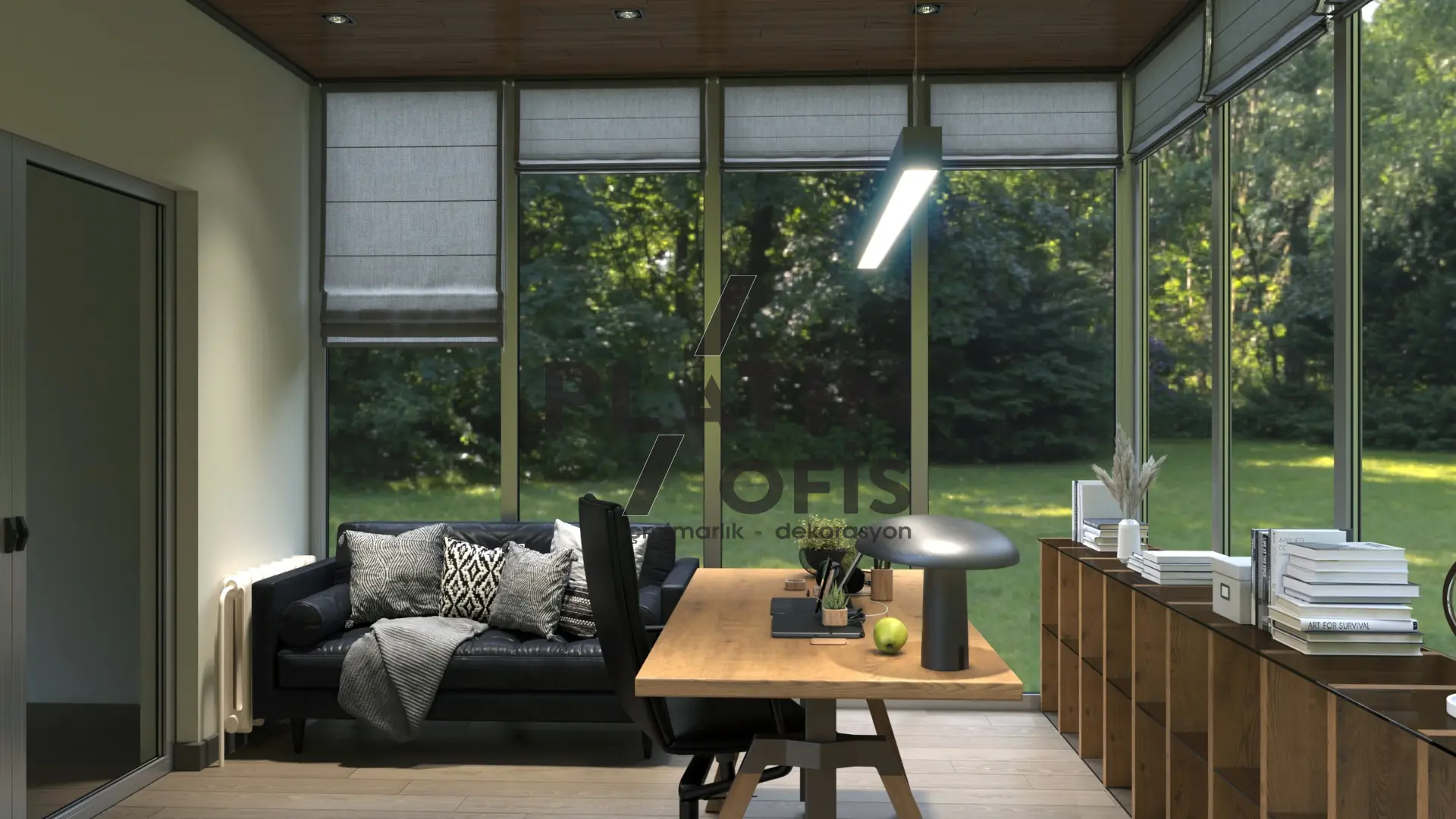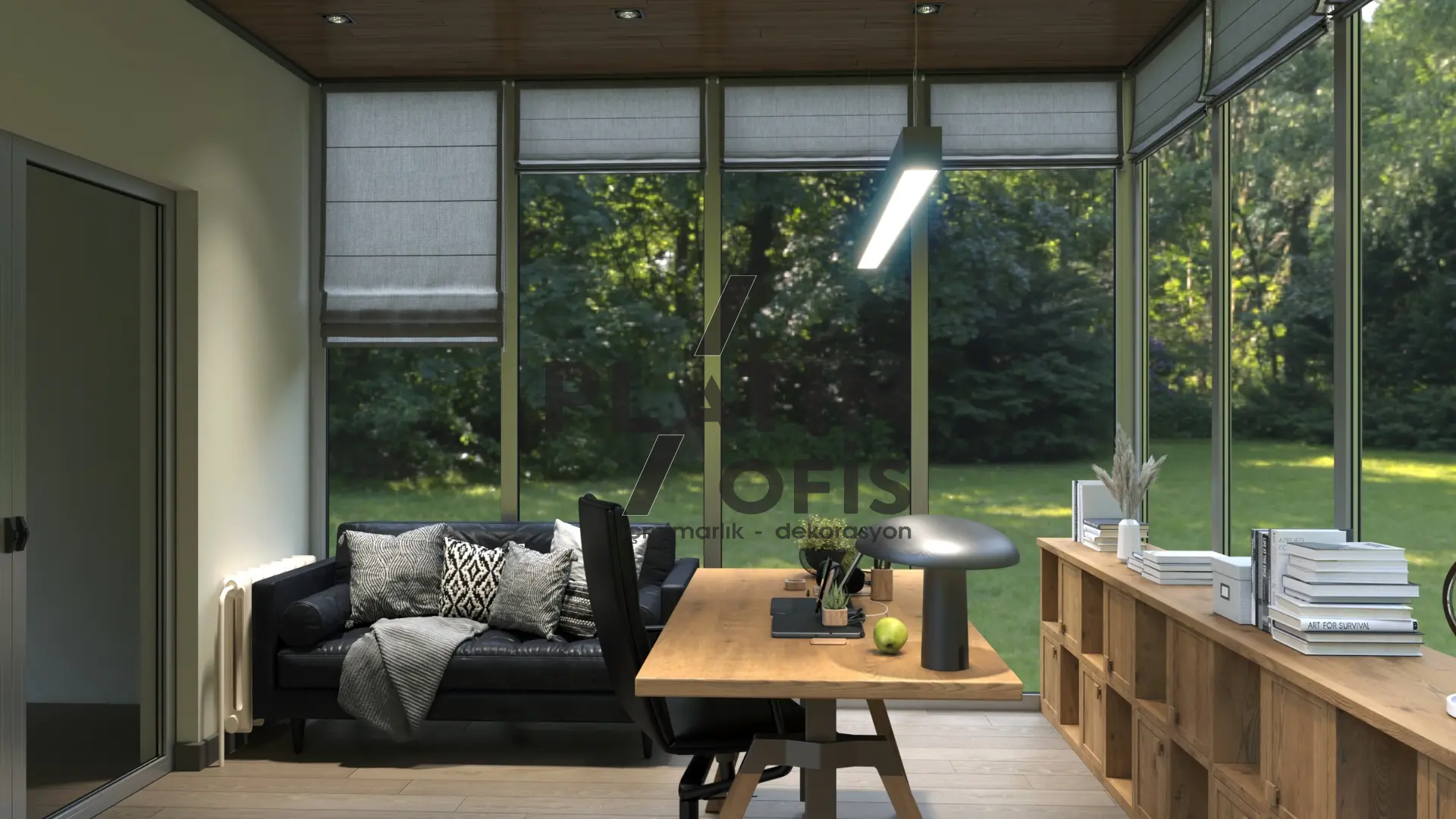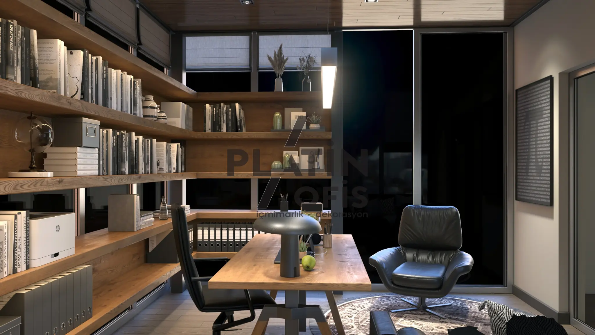 Milenyum Park Villa yetişkin çalışma odası tasarımı projesinde doğal ahşap mobilyalar, geniş panoramik pencereler ve ahşap tavan kaplamaları kullanılarak orman manzarasıyla bütünleşen huzurlu bir çalışma ortamı yaratılmıştır. LED aydınlatmalı açık raf sistemi, masif ahşap L tipi çalışma masası ve siyah deri oturma grubu ile fonksiyonellik ve estetik bir araya getirilmiştir. Modern asma aydınlatmalar, ergonomik mobilyalar ve geniş depolama alanları hem gündüz hem gece kullanımda maksimum verimlilik sağlayarak villanın prestijli ve konforlu bir home office alanına dönüşmesini sağlamıştır.