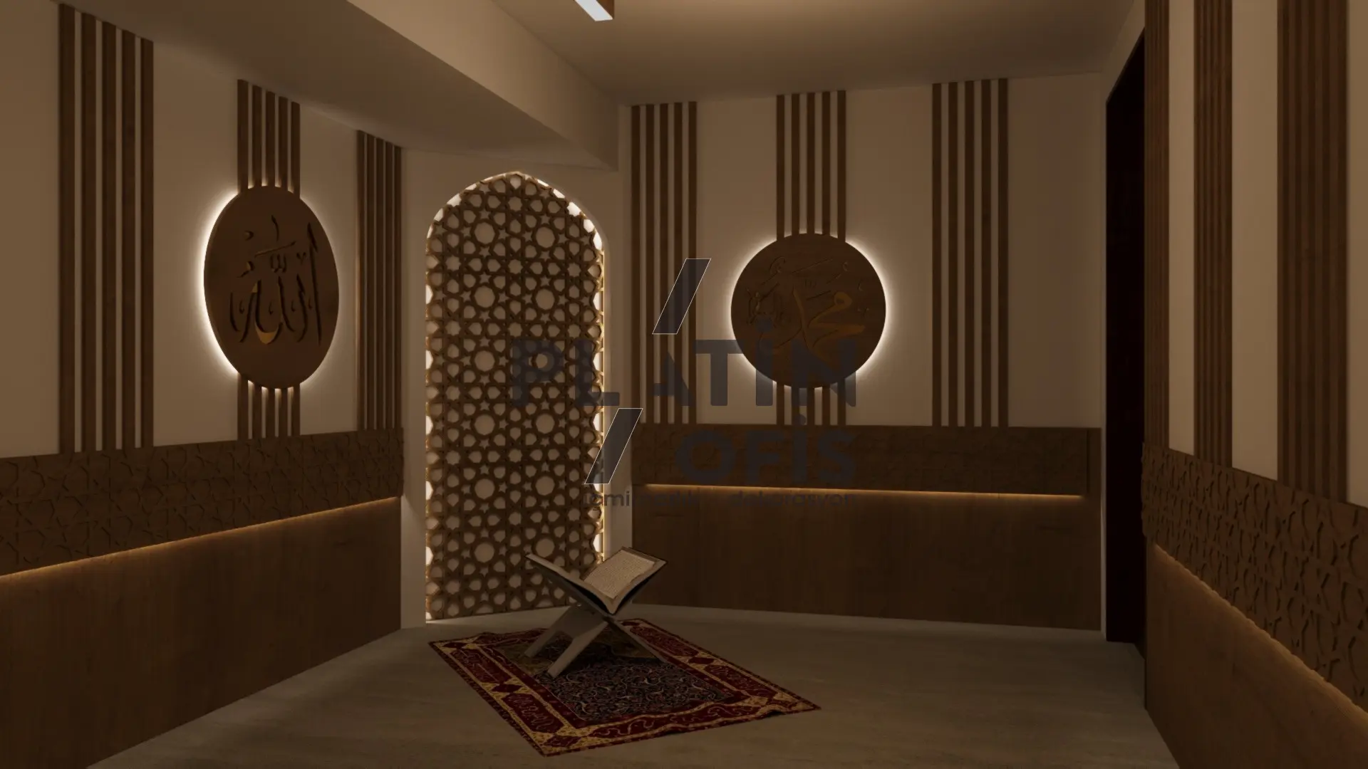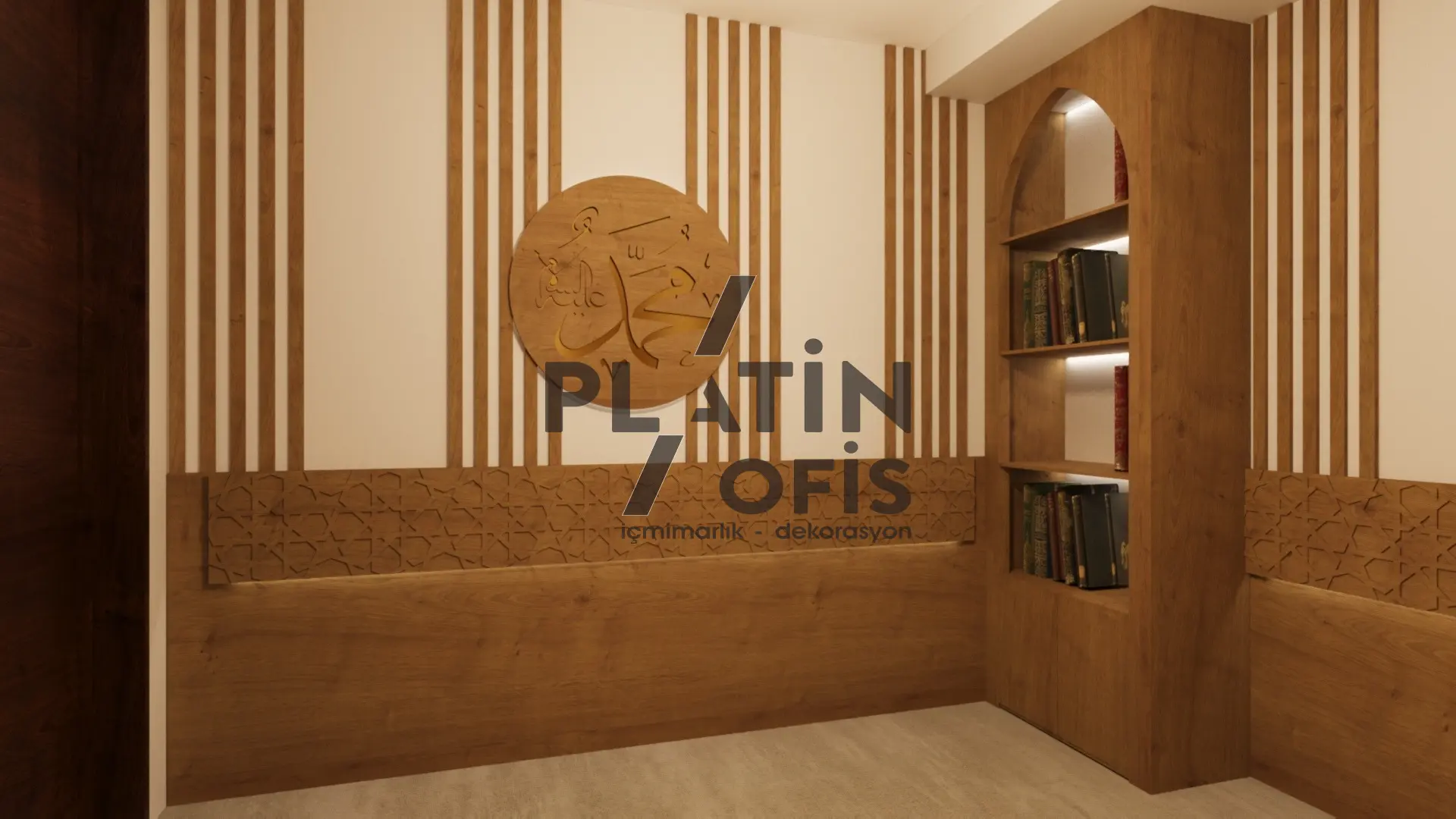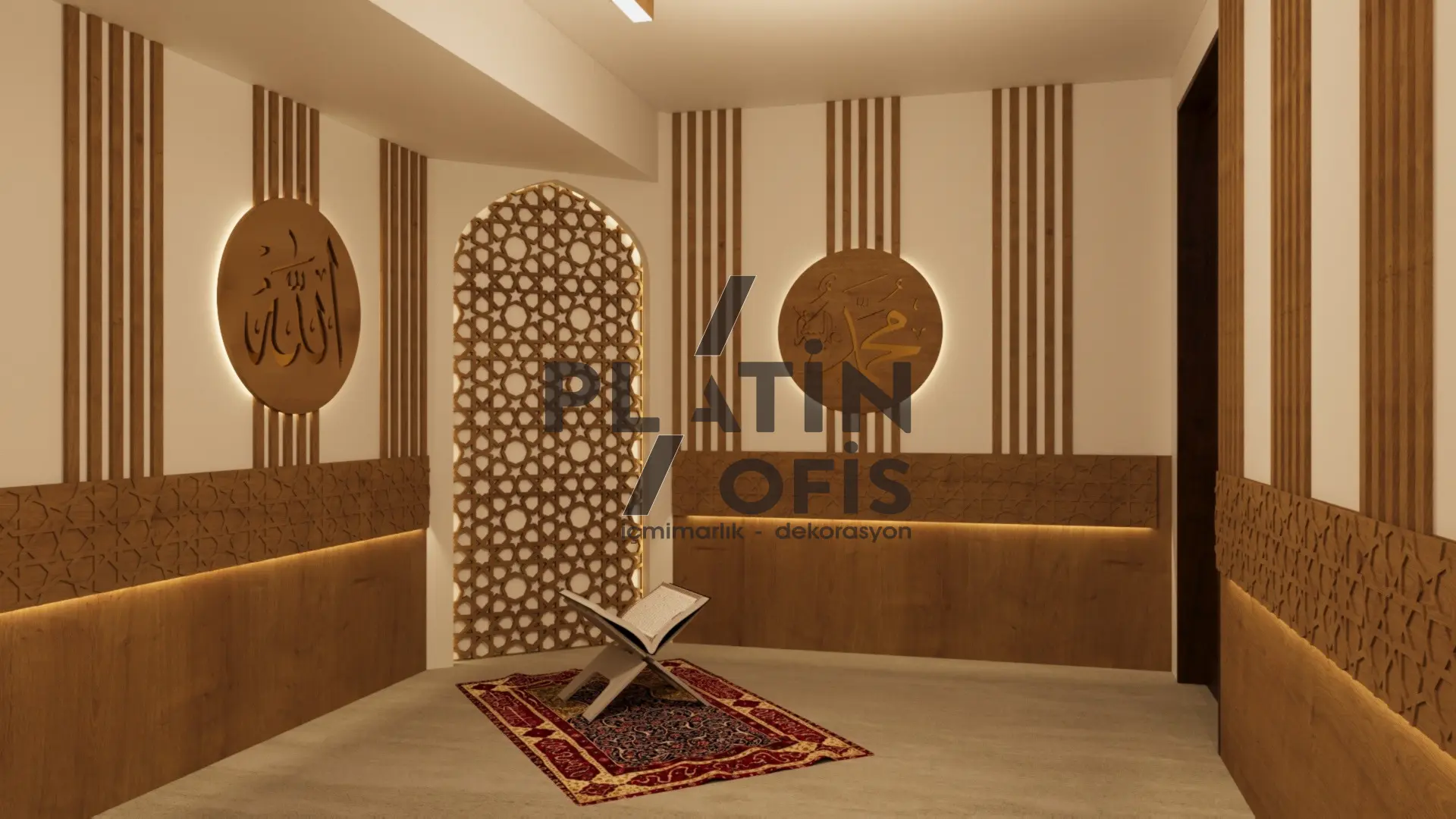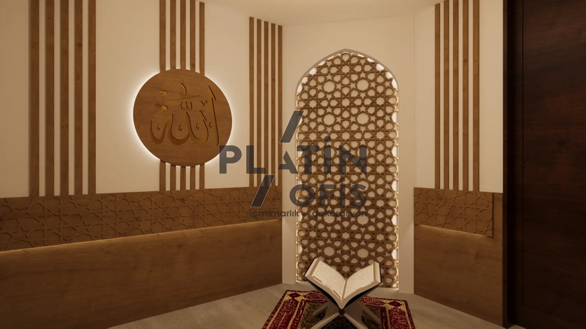 Norm Teknik mescid projesinde ahşap dikey lamel paneller ve geometrik oyma ahşap detaylar sıcak bir ibadet ortamı yaratır. Ana mekânda LED arkadan aydınlatmalı Allah ve Muhammed hat levhaları, kemerli geometrik kafes mihrap ve LED aydınlatmalı kitap nişleriyle modern İslami estetik vurgulanırken, bej taş kaplama abdesthane, ahşap oturma tabureleri ve LED aydınlatmalı ayna detaylarıyla işlevsellik ve maneviyat uyumlu bir şekilde buluşturulmuştur.