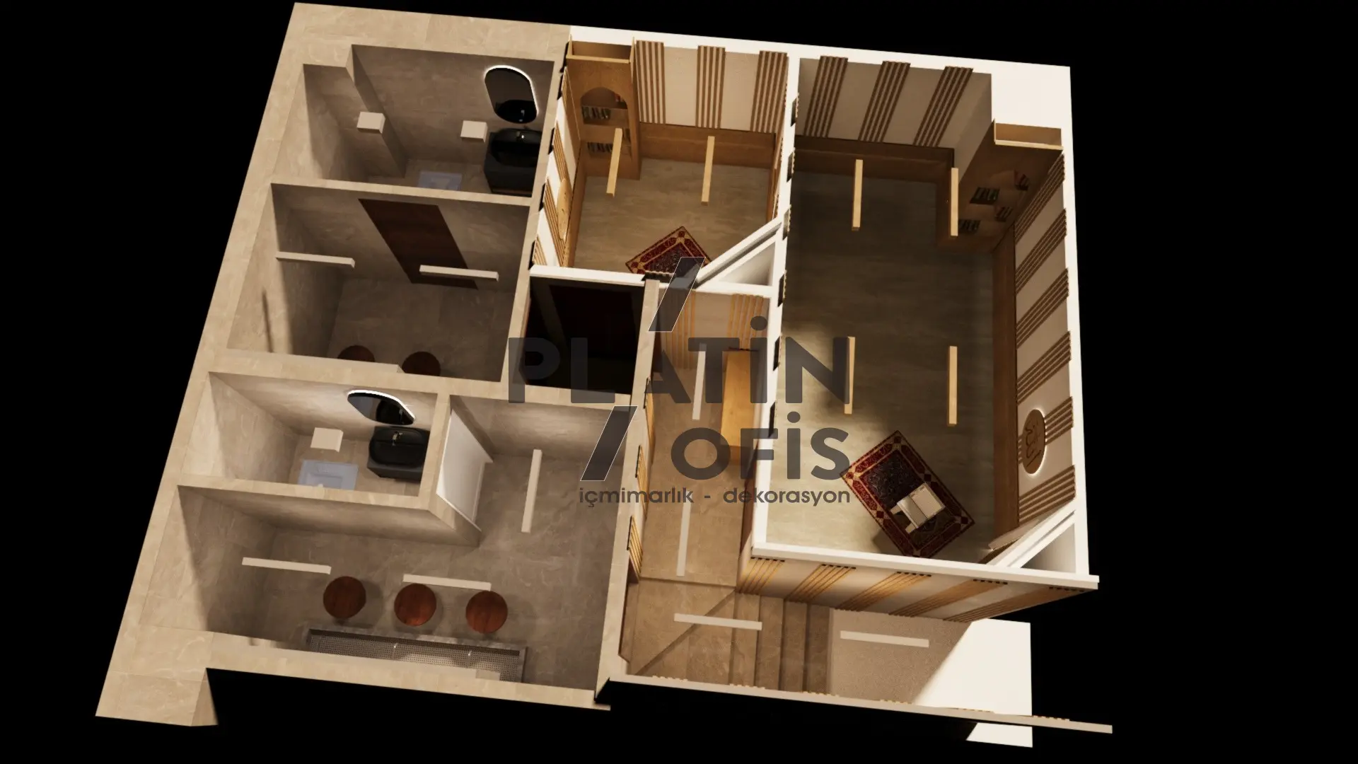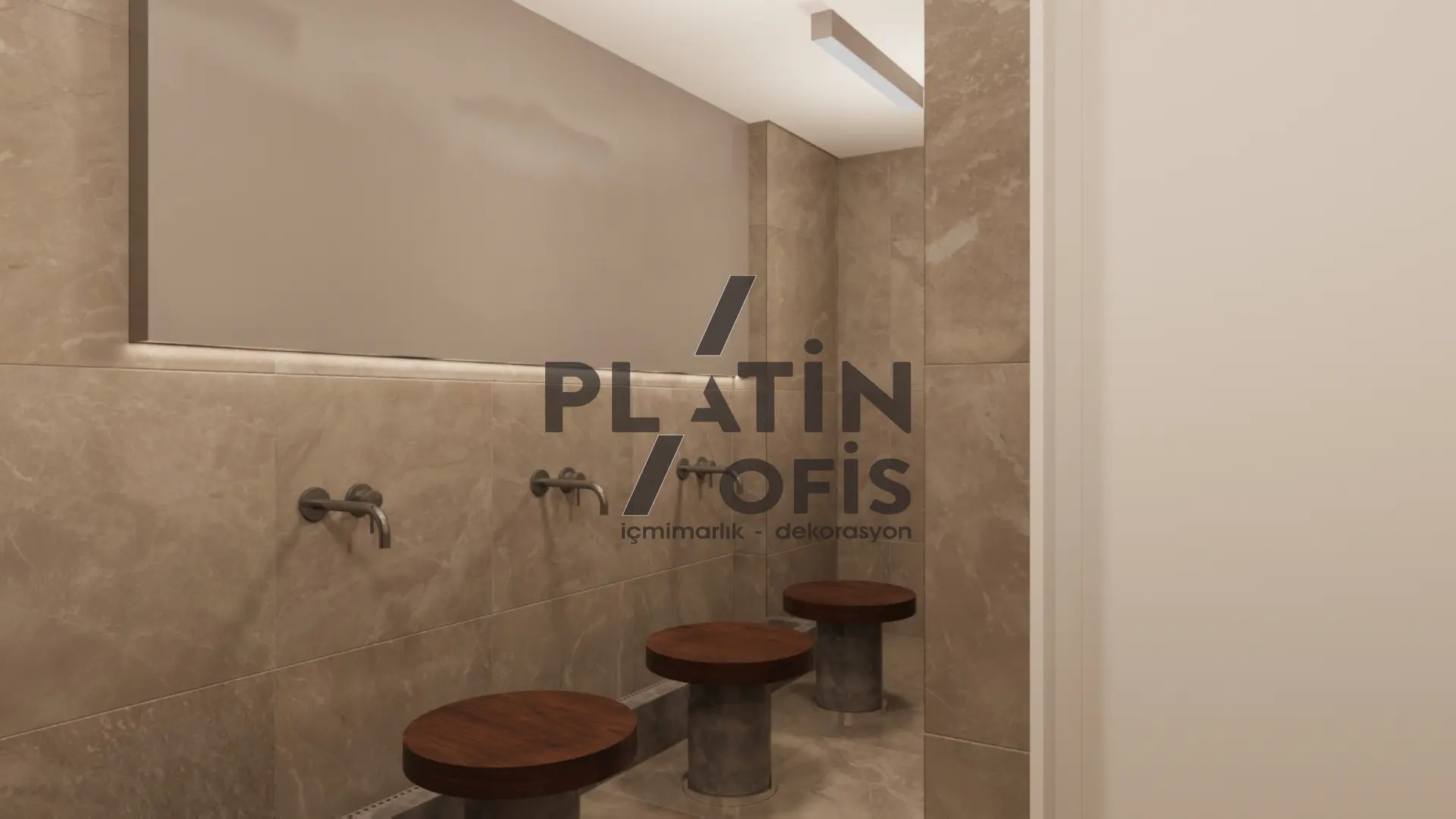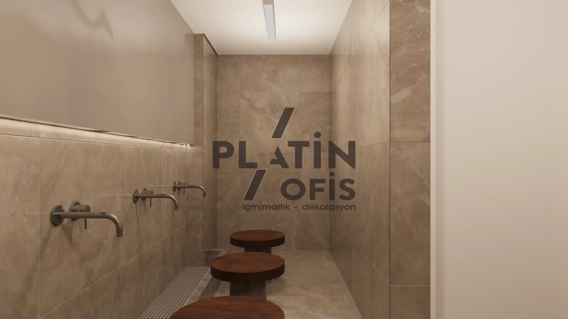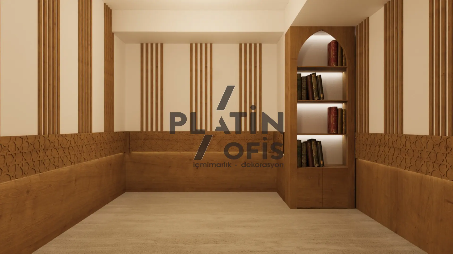Norm Teknik mescid projesinde ahşap dikey lamel paneller ve geometrik oyma ahşap detaylar sıcak bir ibadet ortamı yaratır. Ana mekânda LED arkadan aydınlatmalı Allah ve Muhammed hat levhaları, kemerli geometrik kafes mihrap ve LED aydınlatmalı kitap nişleriyle modern İslami estetik vurgulanırken, bej taş kaplama abdesthane, ahşap oturma tabureleri ve LED aydınlatmalı ayna detaylarıyla işlevsellik ve maneviyat uyumlu bir şekilde buluşturulmuştur.