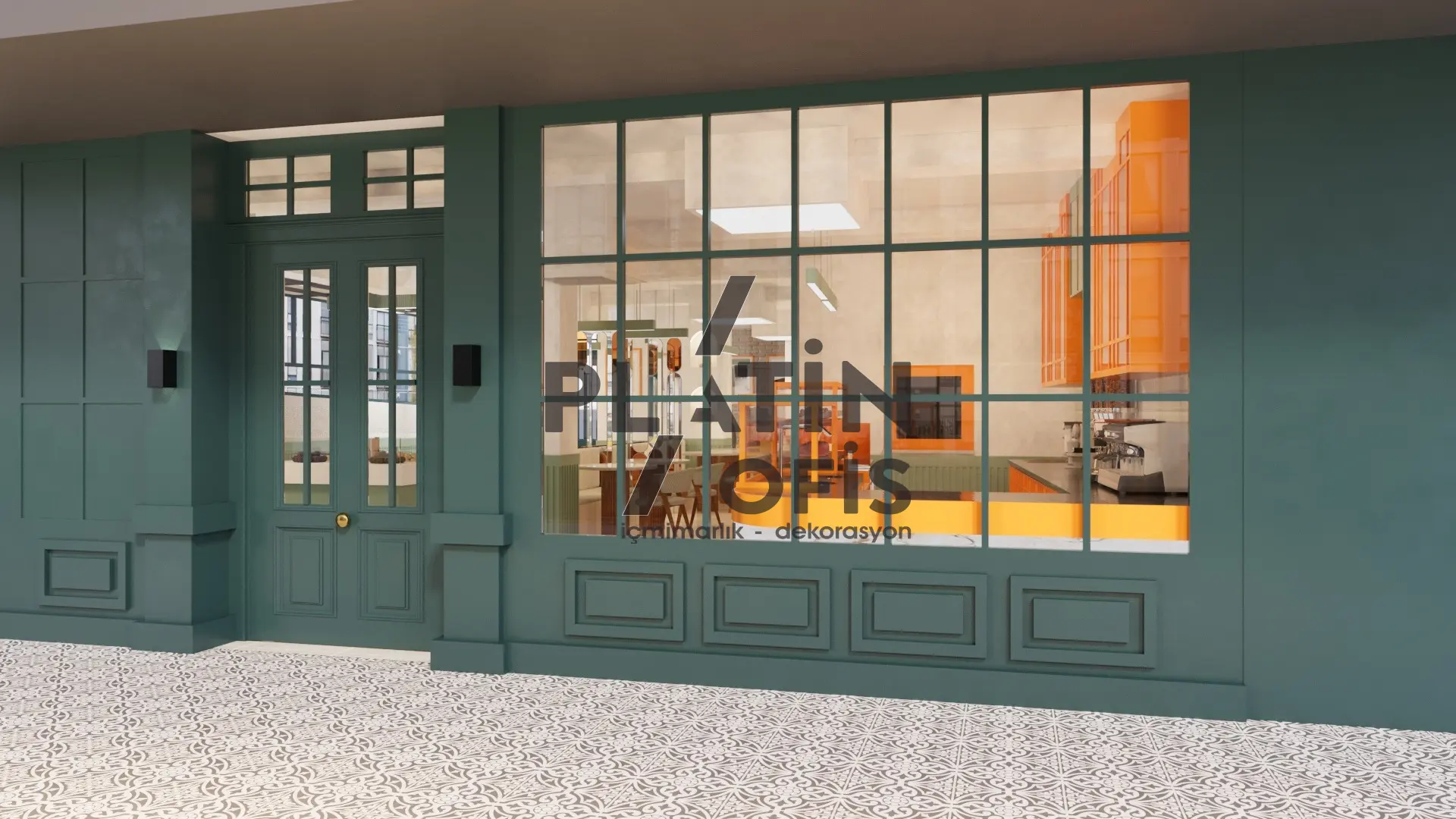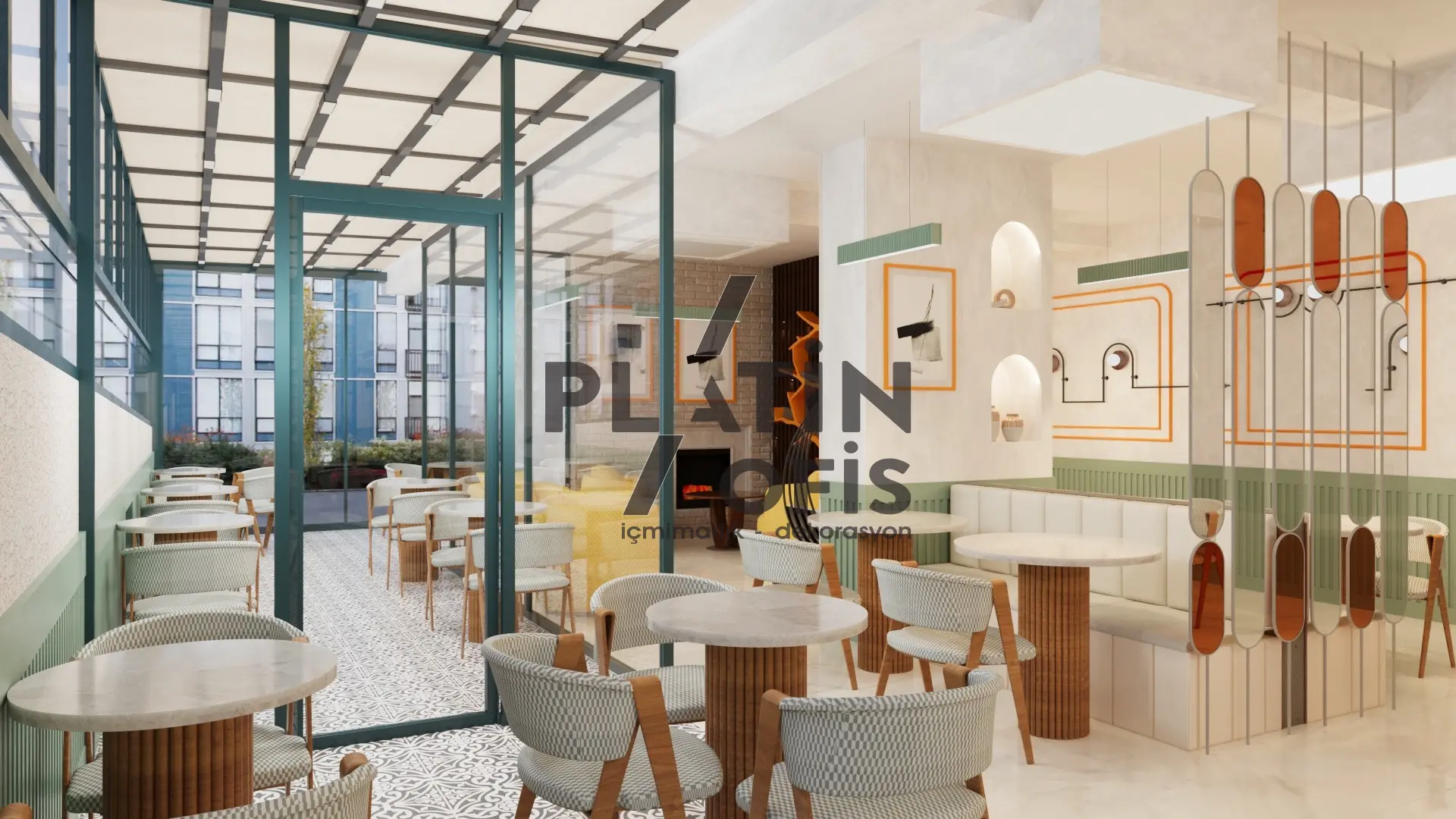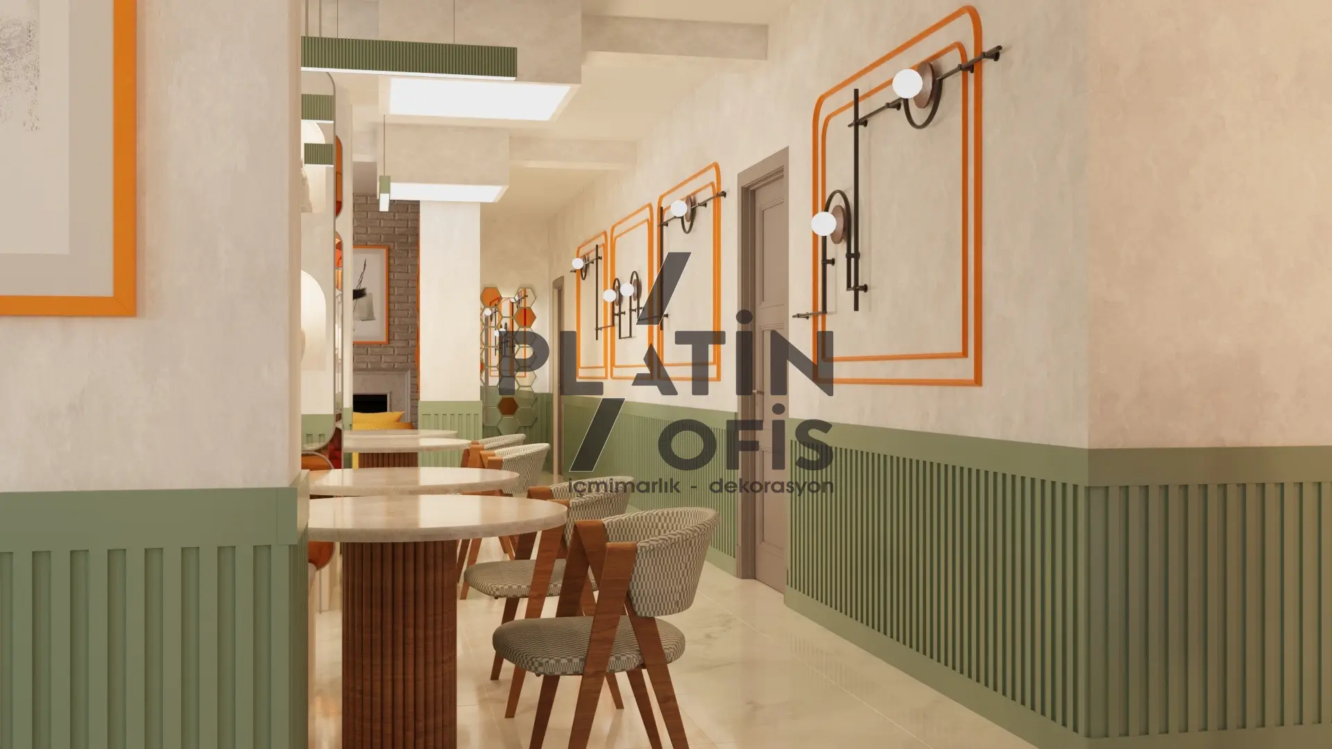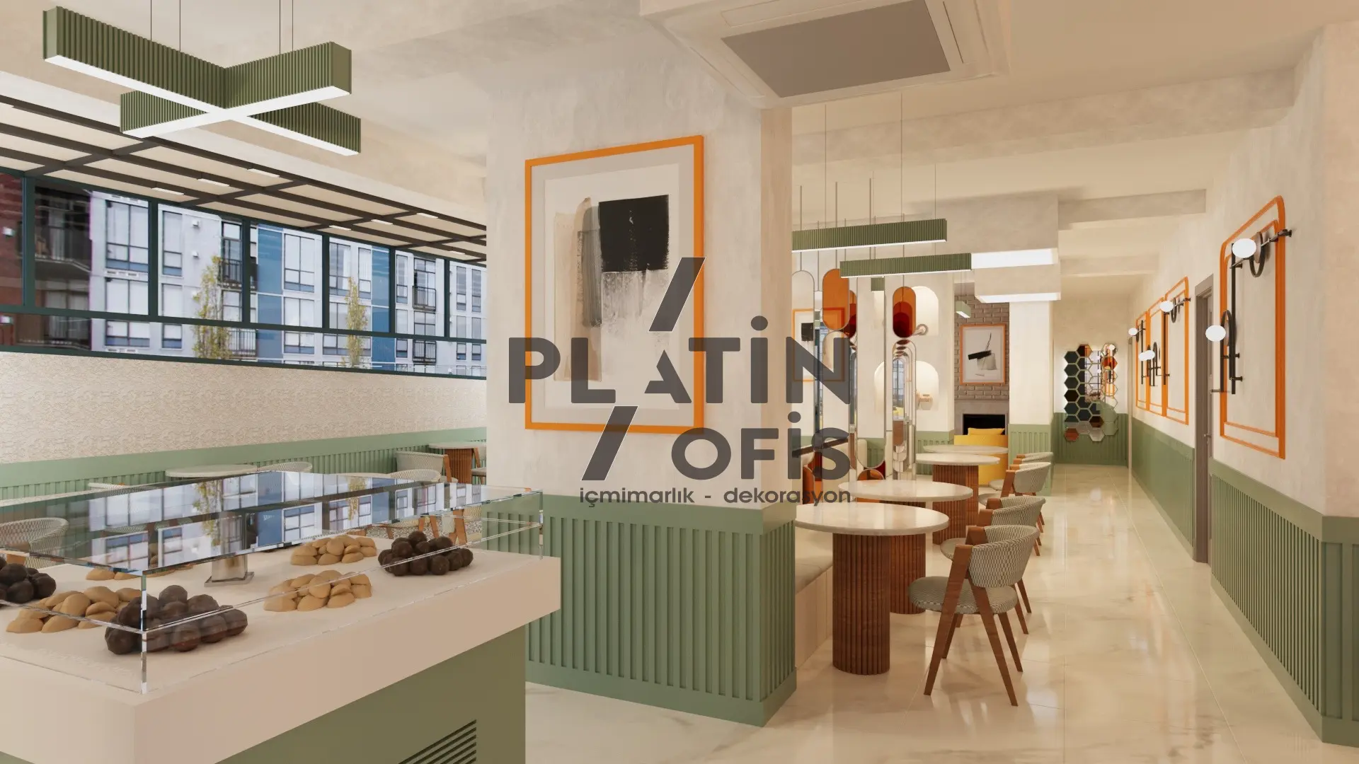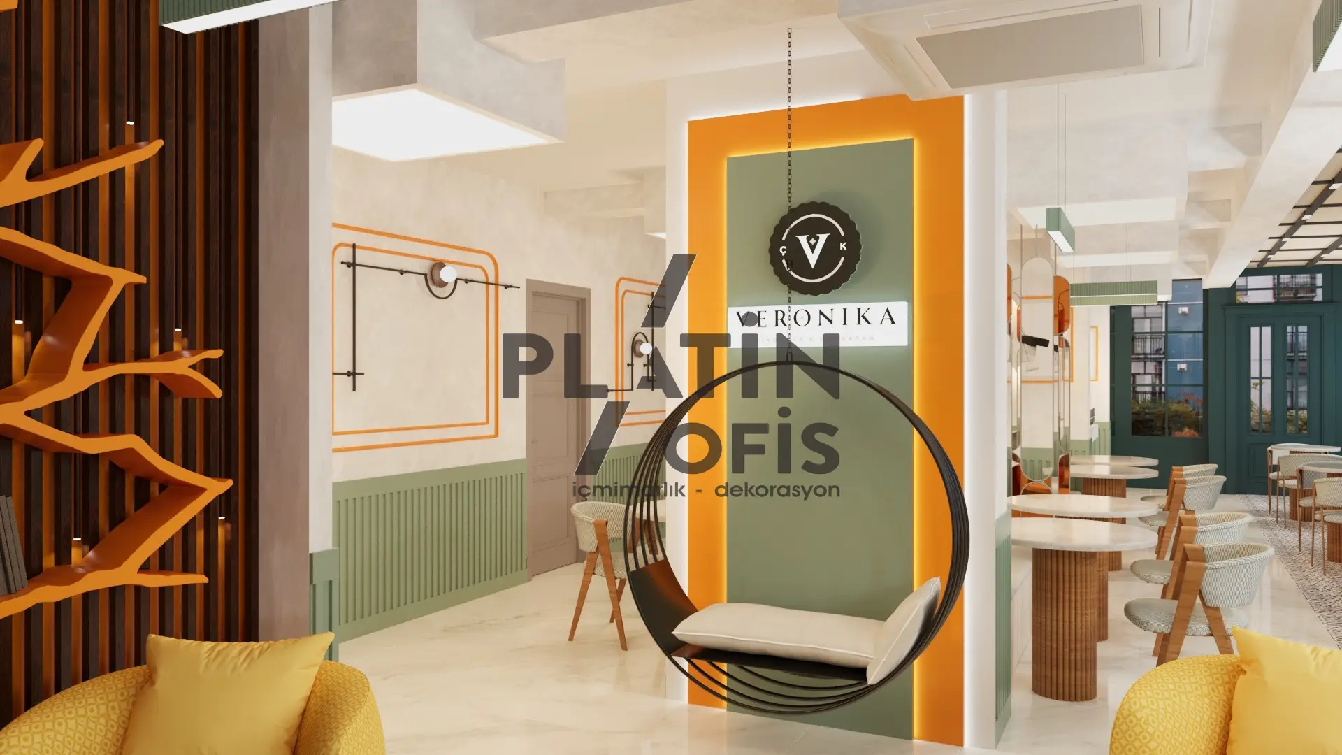 Veronika Kafe iç mimari ve dekorasyon tasarımı projesinde yeşil tonlarda ahşap yivli paneller, turuncu çerçeveli dekoratif aynalar ve hardal sarısı oturma grupları kullanılarak sıcak ve samimi bir atmosfer yaratılmıştır. Mermer tezgah, özel tasarım ağaç kitaplık duvarı ve modern asma aydınlatmalarla mekana özgün bir karakter kazandırılmıştır. Geniş cam yüzeyli yeşil dış cephe ve desenli zemin kaplamaları ise yapıya butik ve davetkâr bir kimlik katarak müşterilere rahat ve şık bir kafe deneyimi sunmaktadır.