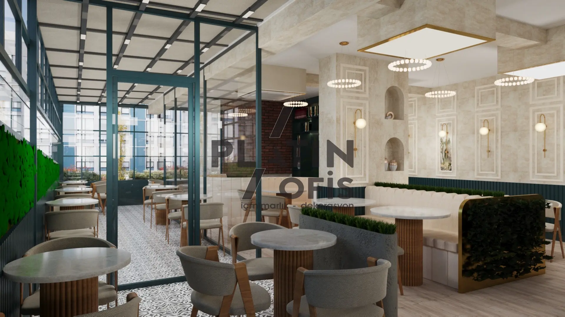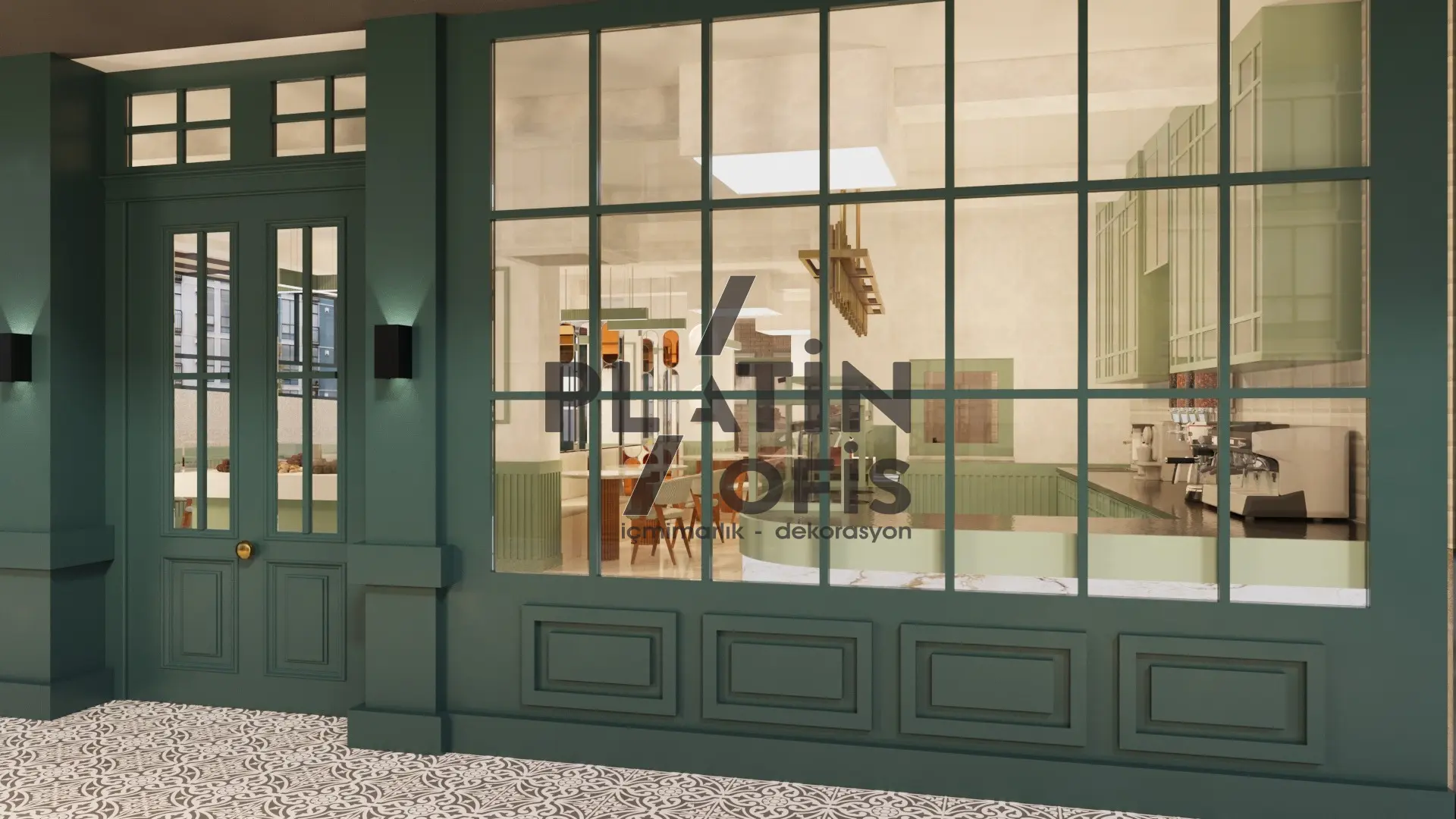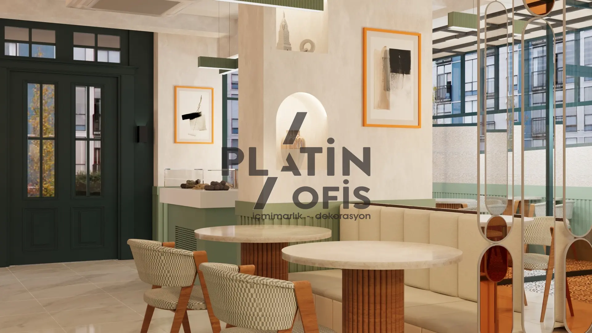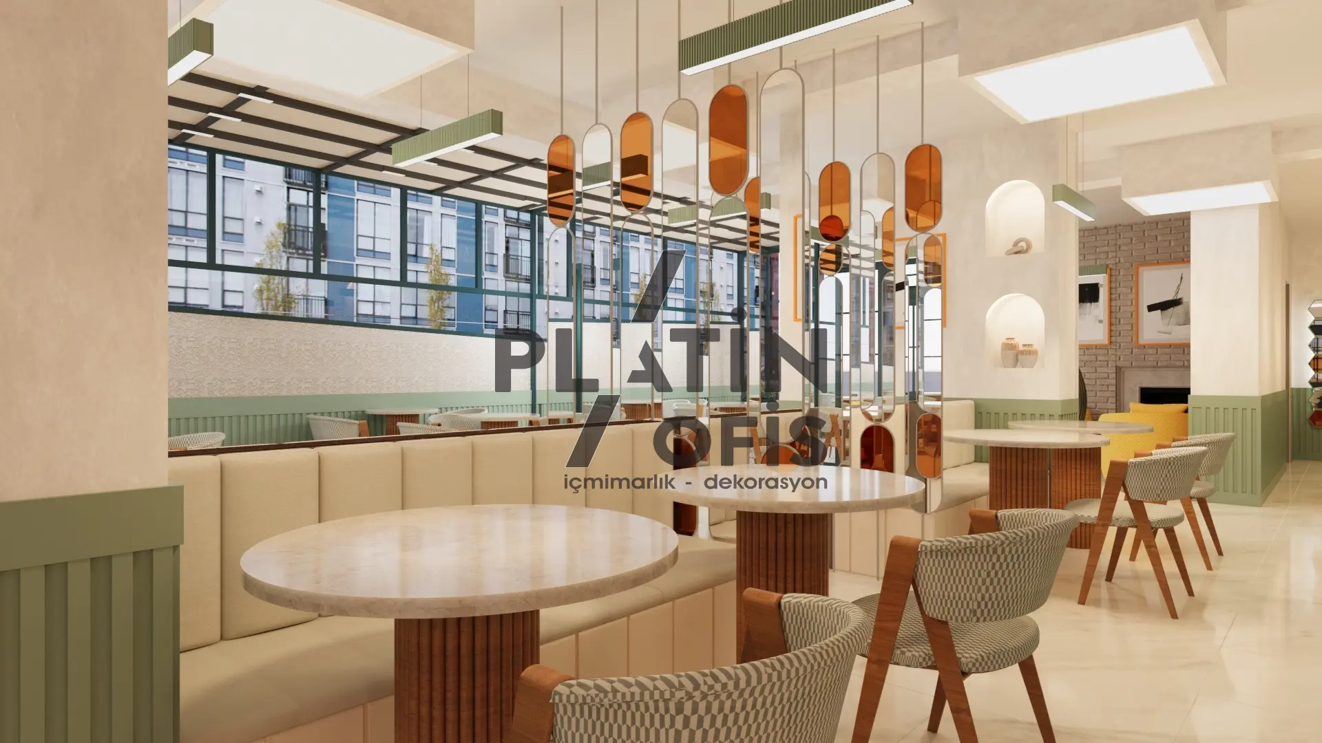 Veronika Kafe iç mimari ve dekorasyon tasarımı projesinde yeşil tonlarda ahşap yivli paneller, turuncu çerçeveli dekoratif aynalar ve hardal sarısı oturma grupları kullanılarak sıcak ve samimi bir atmosfer yaratılmıştır. Mermer tezgah, özel tasarım ağaç kitaplık duvarı ve modern asma aydınlatmalarla mekana özgün bir karakter kazandırılmıştır. Geniş cam yüzeyli yeşil dış cephe ve desenli zemin kaplamaları ise yapıya butik ve davetkâr bir kimlik katarak müşterilere rahat ve şık bir kafe deneyimi sunmaktadır.