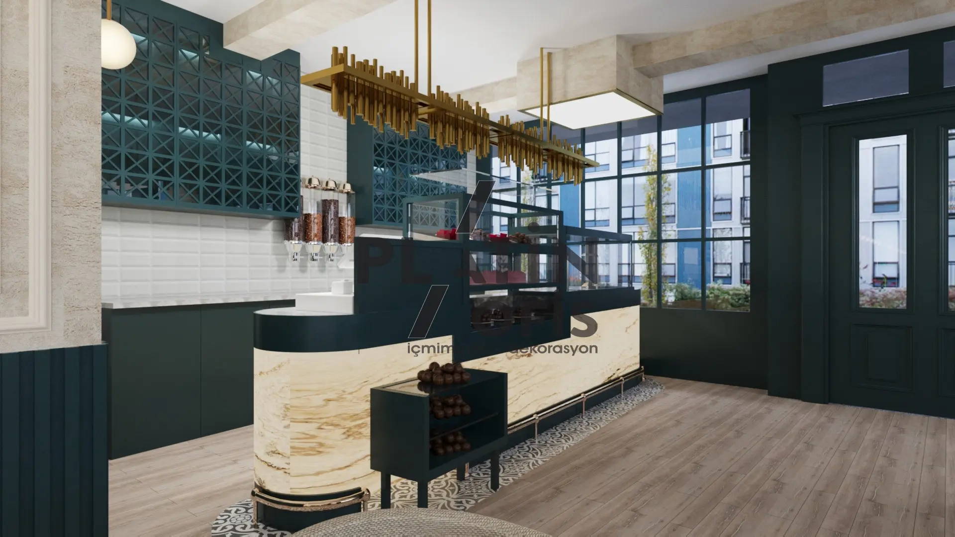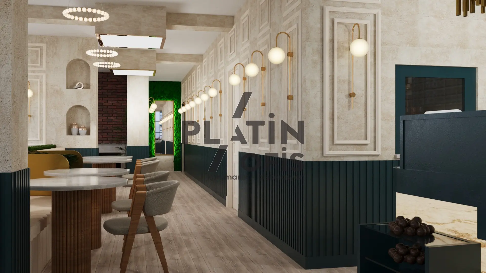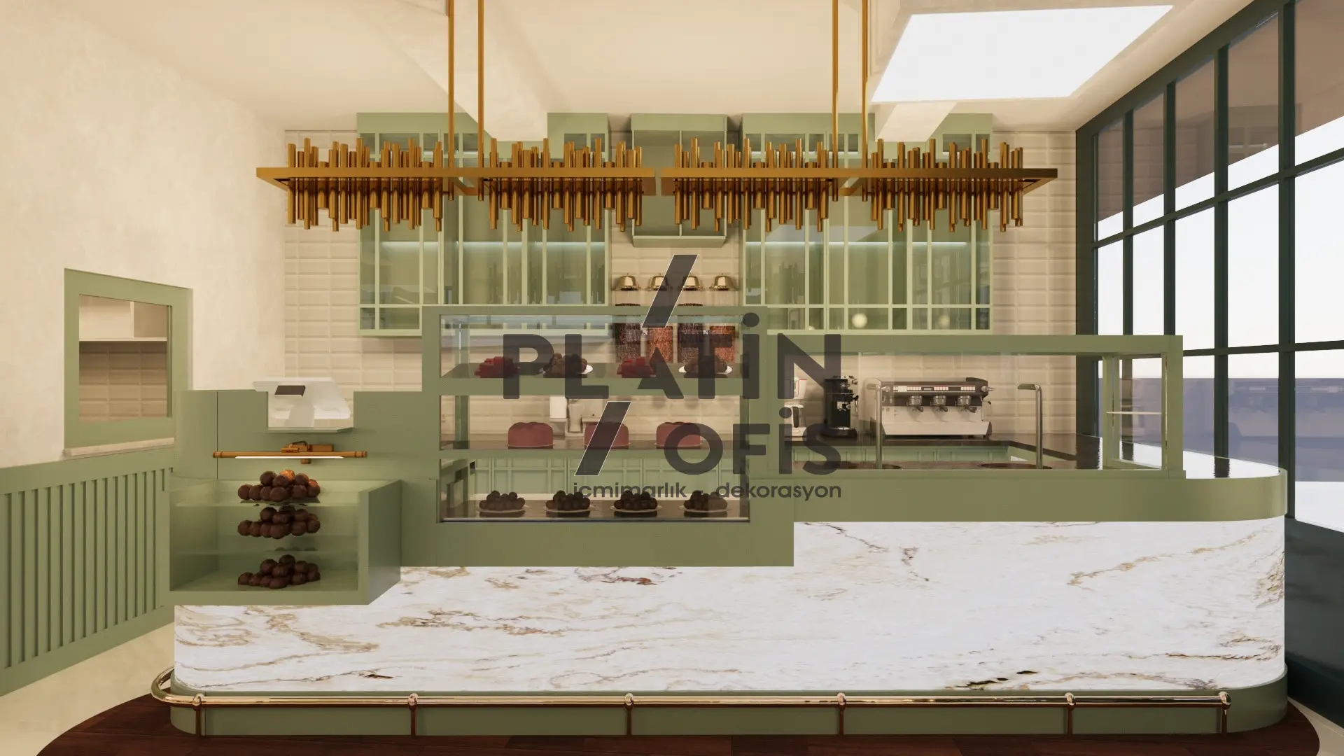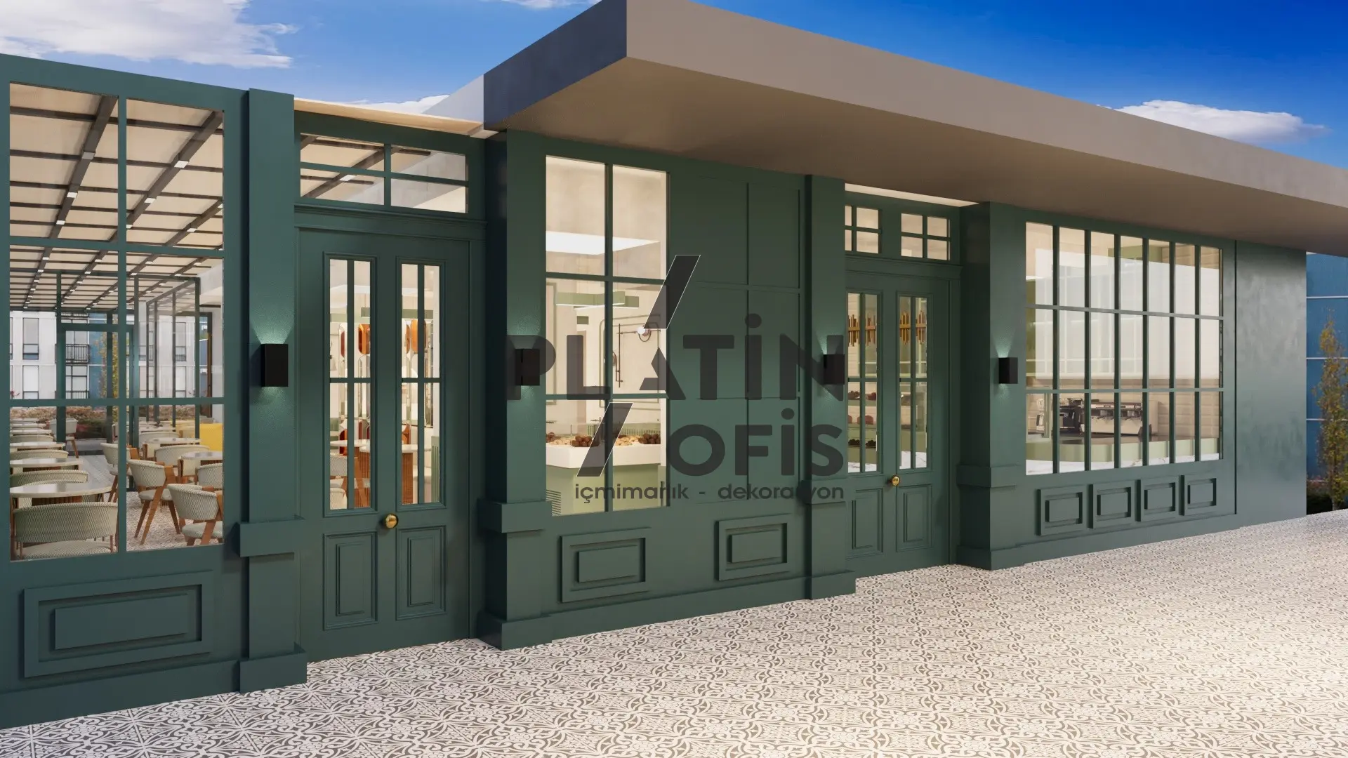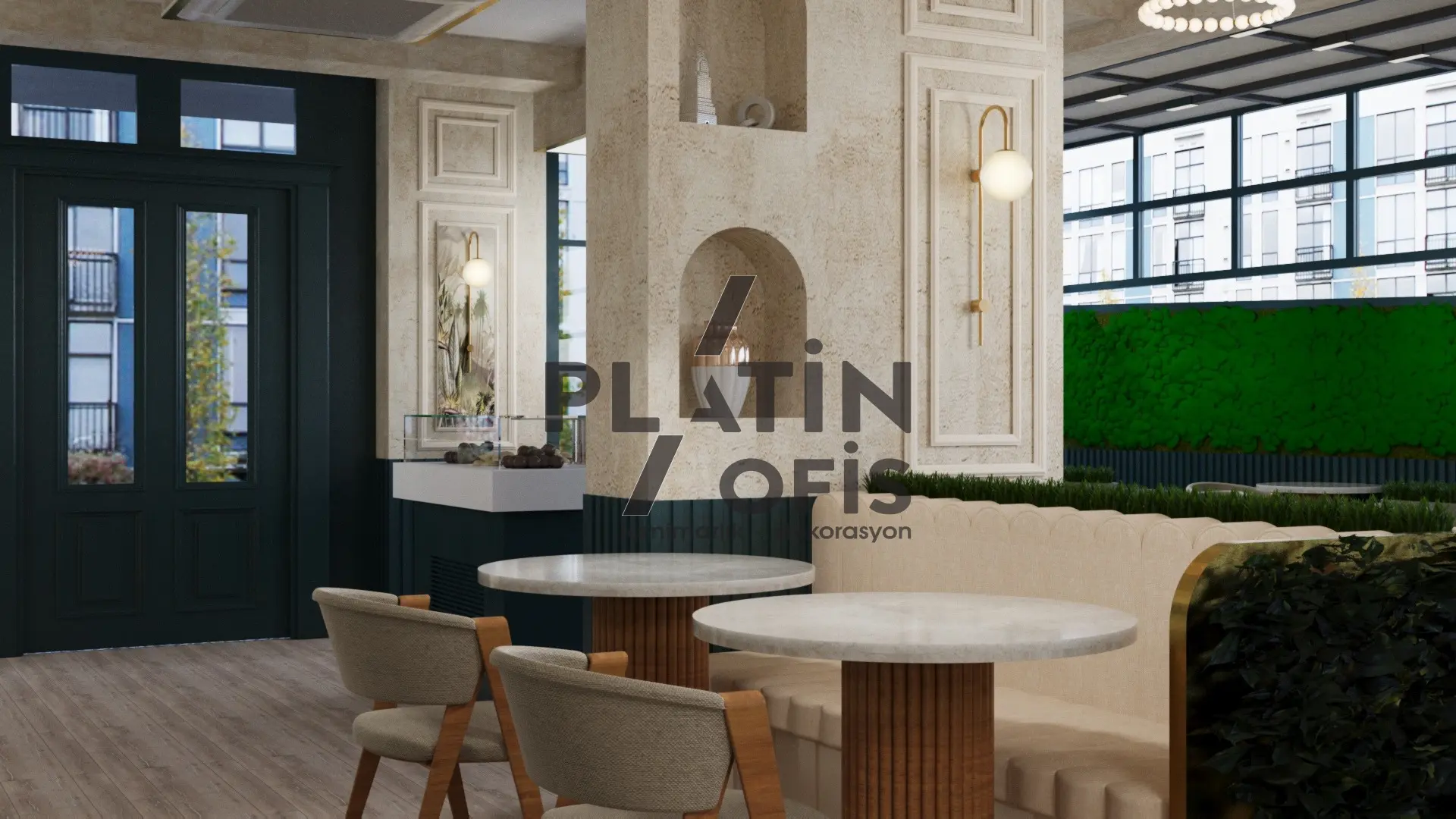 Veronika Kafe iç mimari ve dekorasyon tasarımı projesinde yeşil tonlarda ahşap yivli paneller, turuncu çerçeveli dekoratif aynalar ve hardal sarısı oturma grupları kullanılarak sıcak ve samimi bir atmosfer yaratılmıştır. Mermer tezgah, özel tasarım ağaç kitaplık duvarı ve modern asma aydınlatmalarla mekana özgün bir karakter kazandırılmıştır. Geniş cam yüzeyli yeşil dış cephe ve desenli zemin kaplamaları ise yapıya butik ve davetkâr bir kimlik katarak müşterilere rahat ve şık bir kafe deneyimi sunmaktadır.