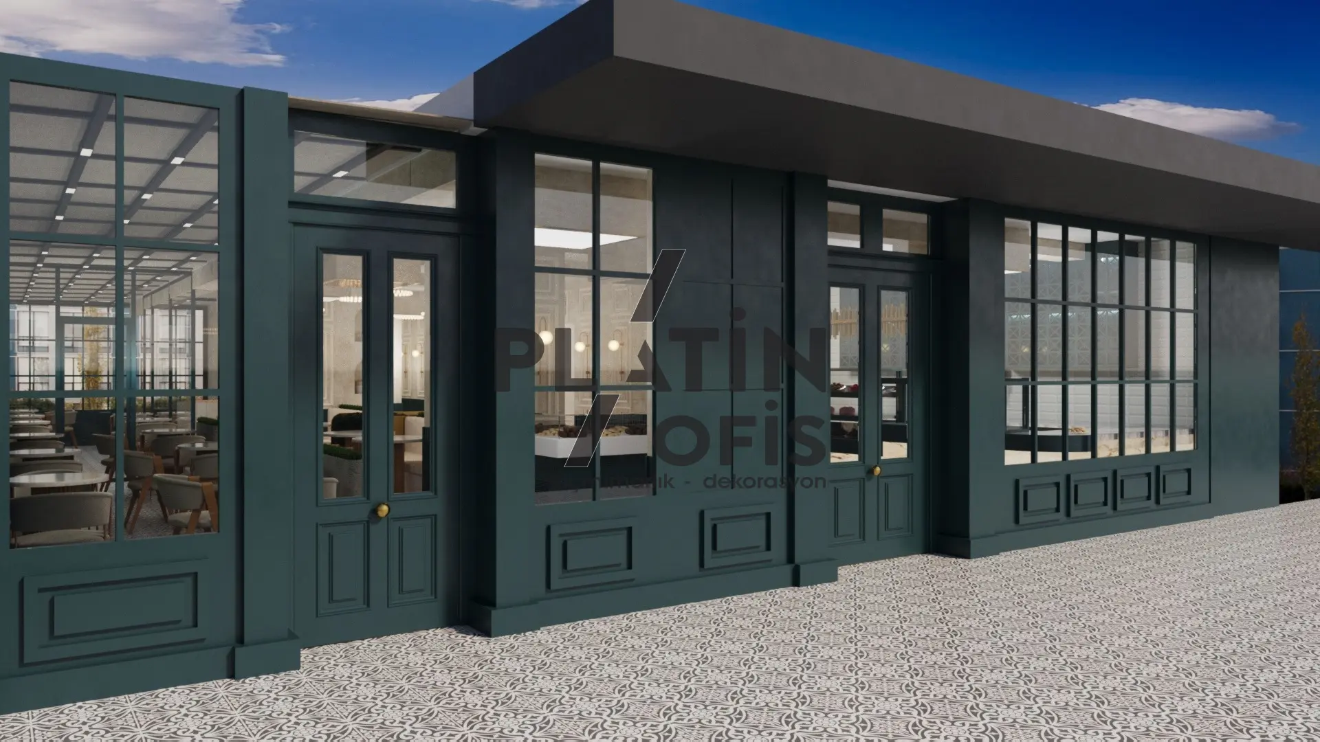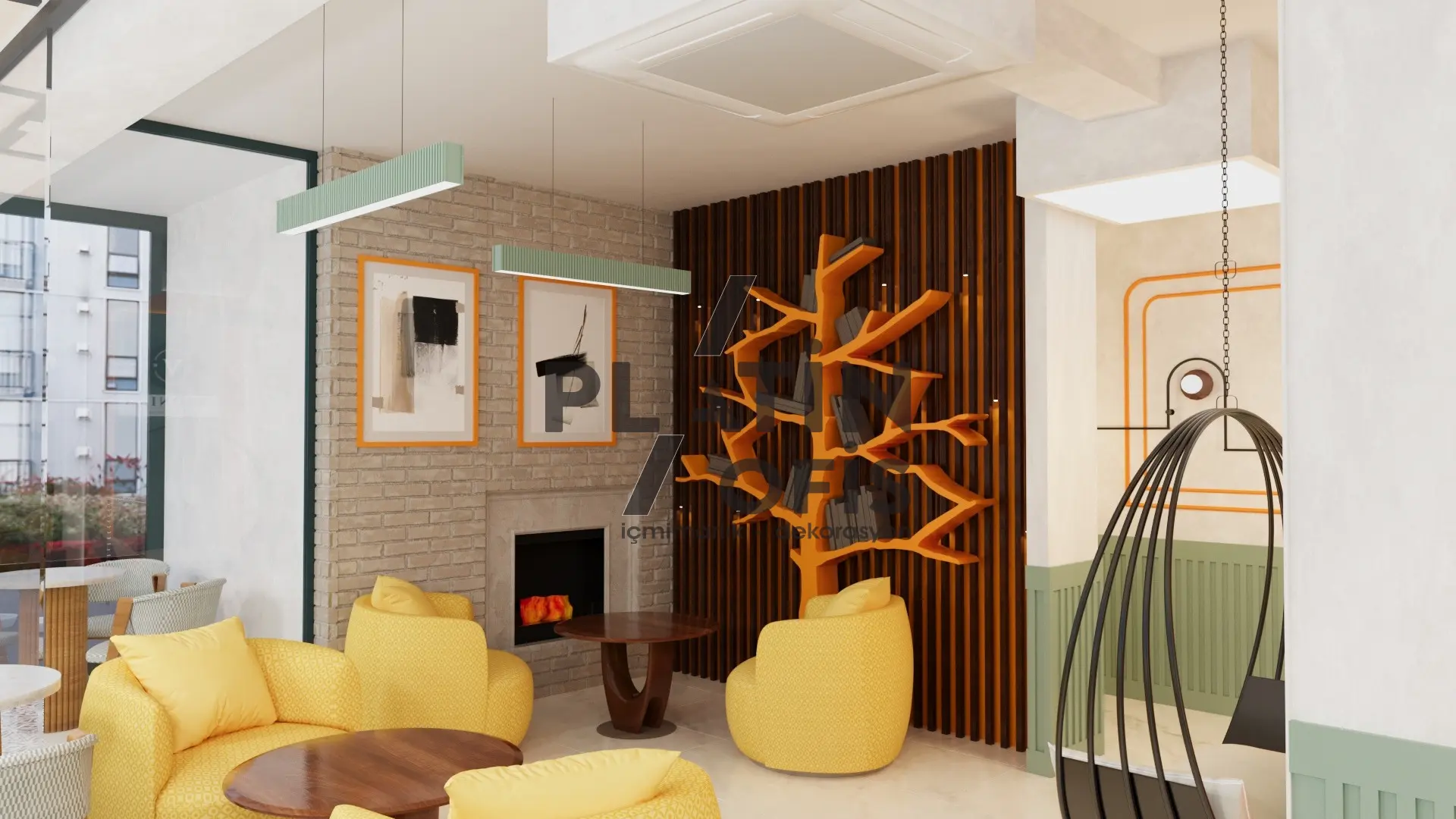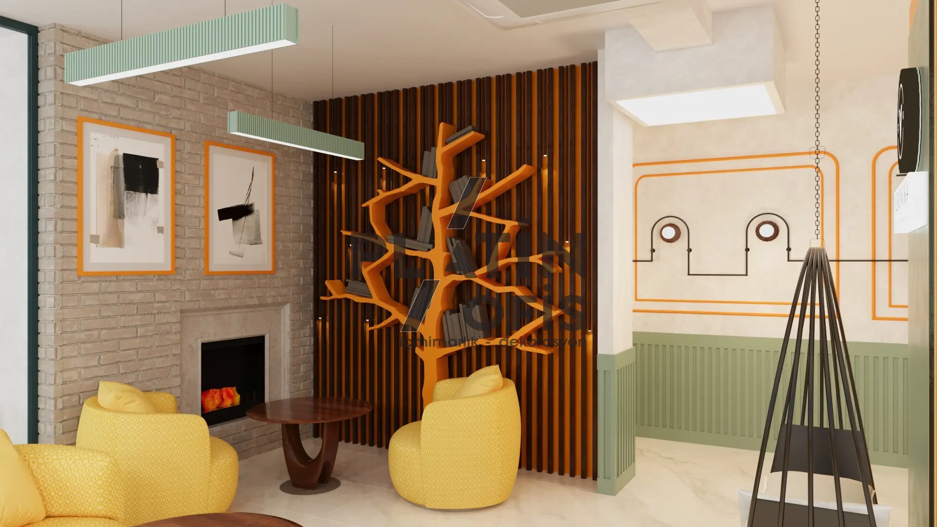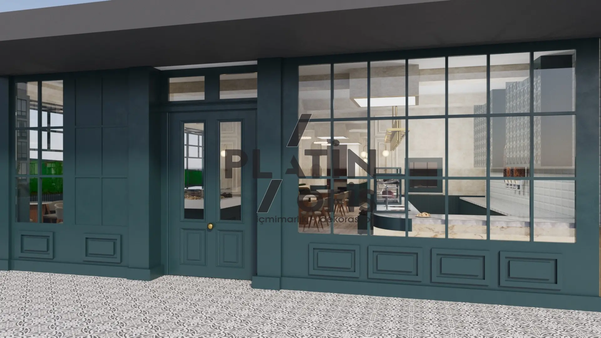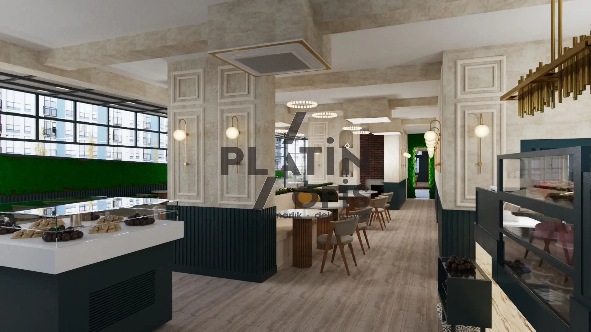Veronika Kafe iç mimari ve dekorasyon tasarımı projesinde yeşil tonlarda ahşap yivli paneller, turuncu çerçeveli dekoratif aynalar ve hardal sarısı oturma grupları kullanılarak sıcak ve samimi bir atmosfer yaratılmıştır. Mermer tezgah, özel tasarım ağaç kitaplık duvarı ve modern asma aydınlatmalarla mekana özgün bir karakter kazandırılmıştır. Geniş cam yüzeyli yeşil dış cephe ve desenli zemin kaplamaları ise yapıya butik ve davetkâr bir kimlik katarak müşterilere rahat ve şık bir kafe deneyimi sunmaktadır.