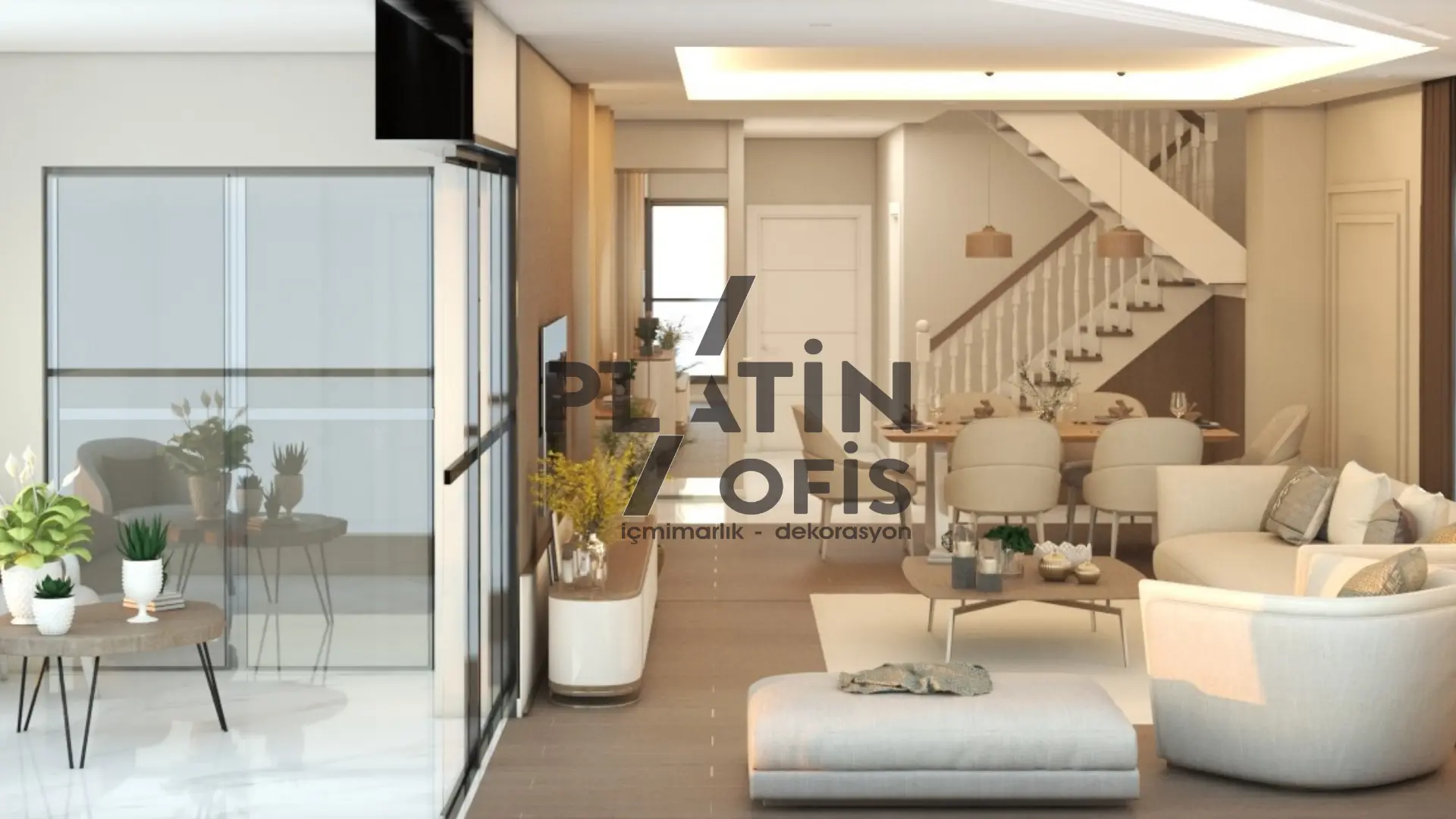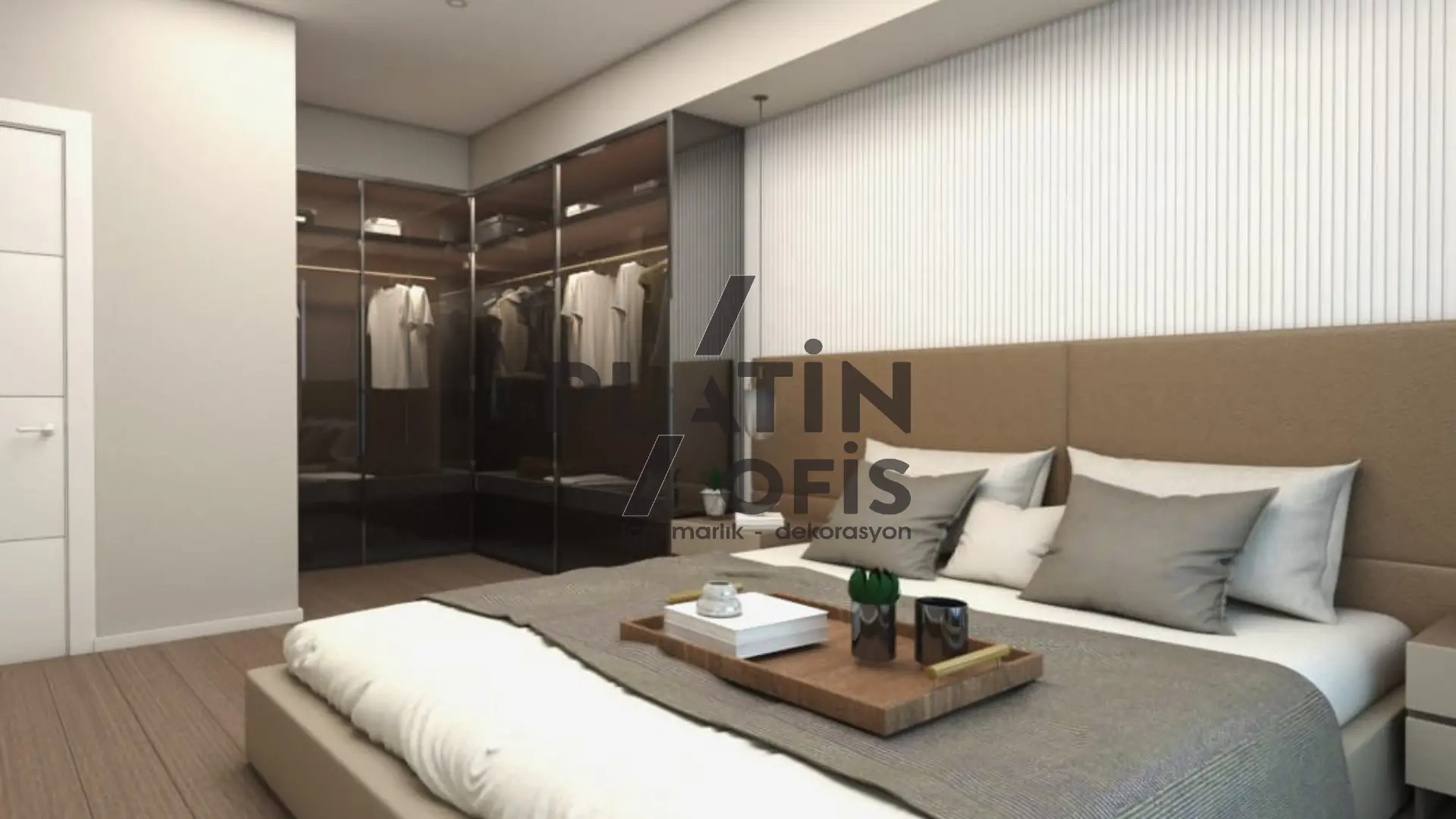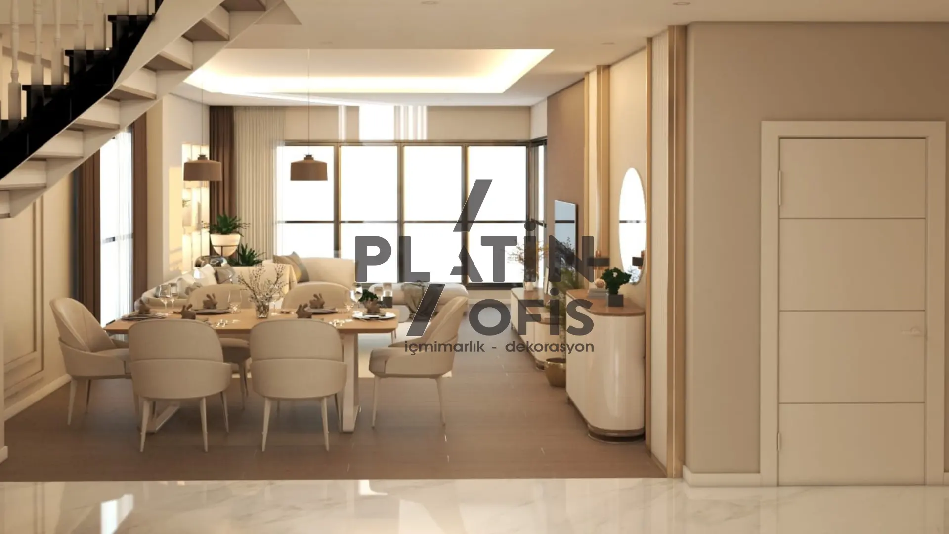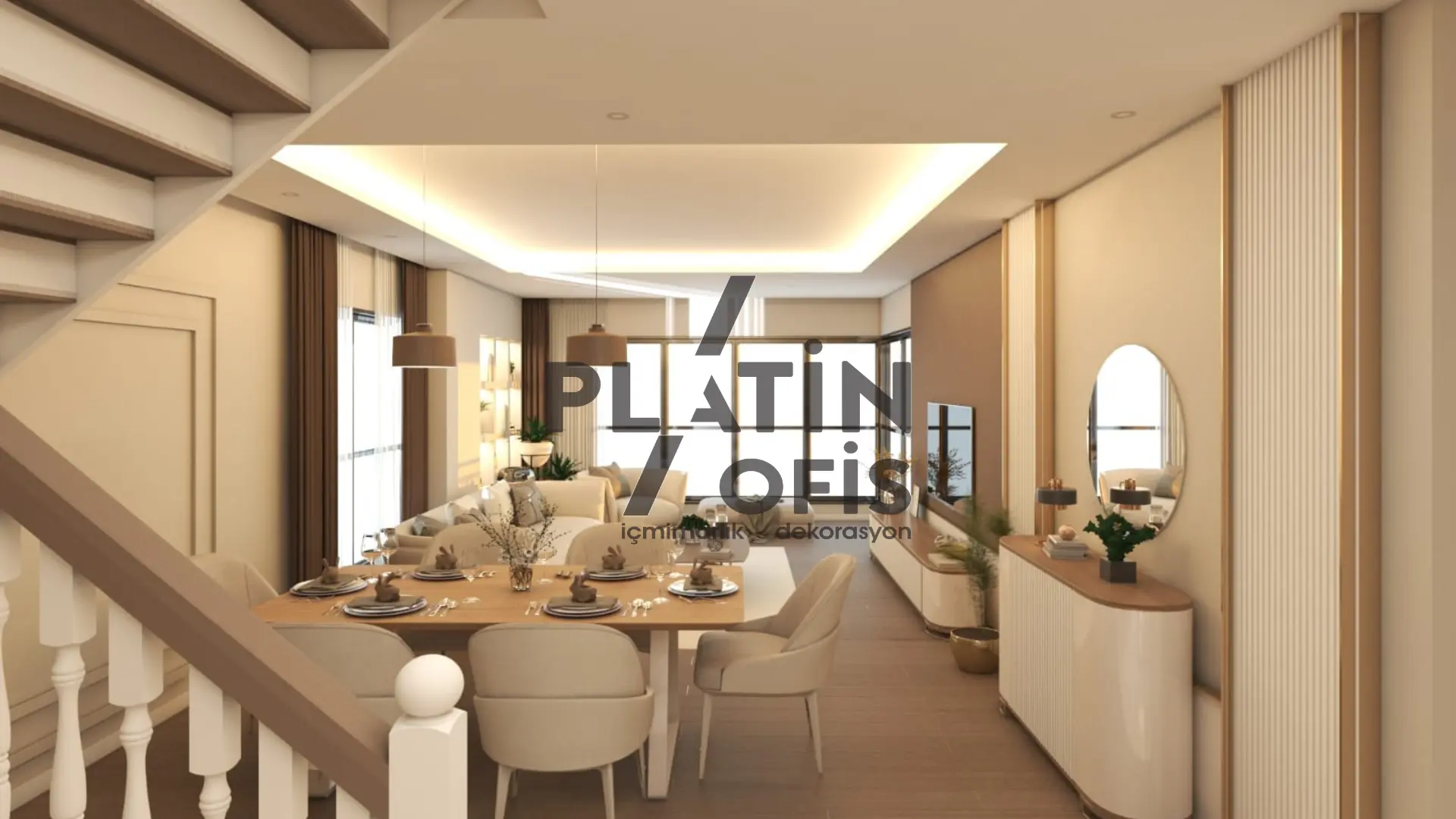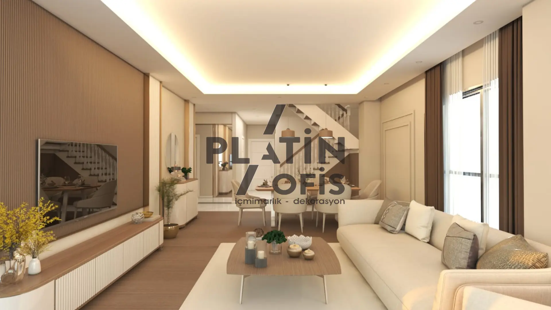 Yunus Kartal Ev iç mimari ve dekorasyon tasarımı projesinde bej, krem ve kahverengi tonları kullanılarak sıcak ve modern bir atmosfer oluşturulmuştur. Ahşap yivli duvar kaplamaları, gizli aydınlatmalı asma tavanlar ve mermer detaylı TV üniteleri ile estetik ve fonksiyonellik bir araya getirilmiştir. LED aydınlatmalı walk-in gardıroplar, geniş balkon alanları ve açık plan yaşam konsepti ile duplex yapı, aileler için konforlu ve prestijli bir yaşam alanına dönüştürülmüştür.