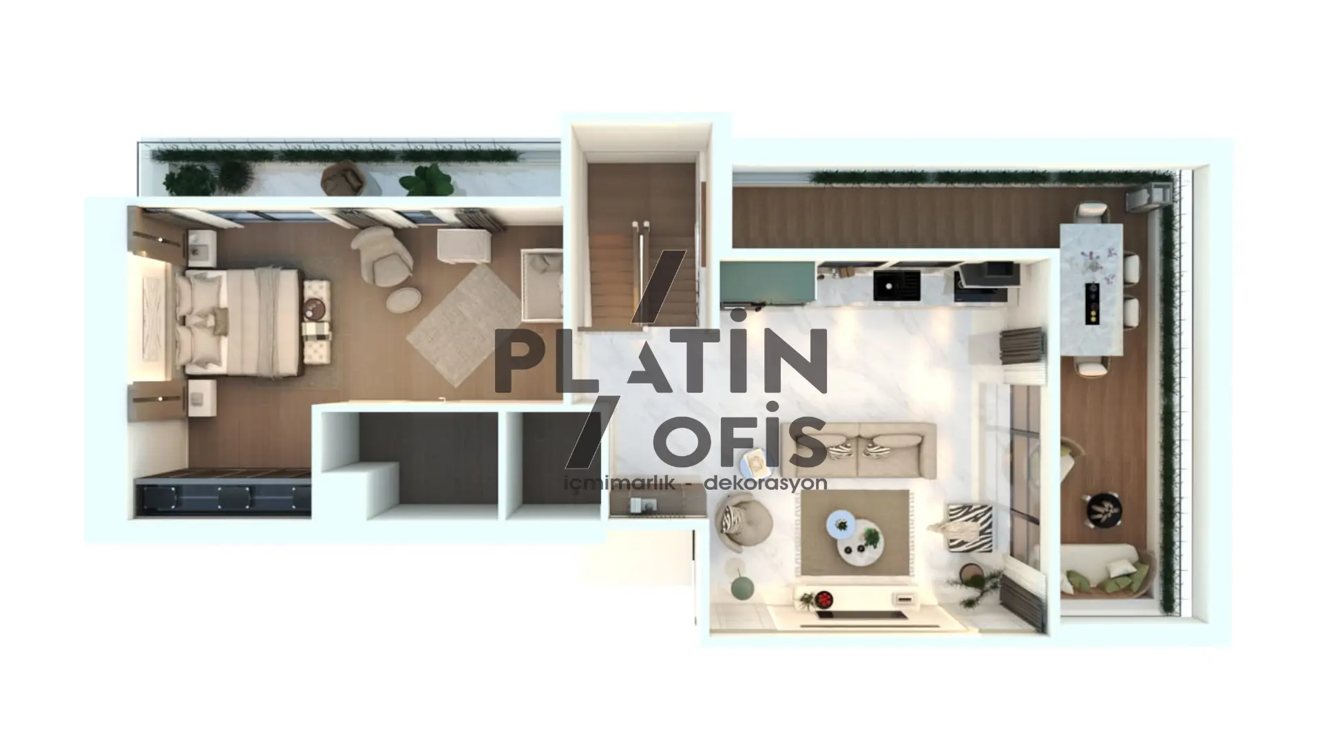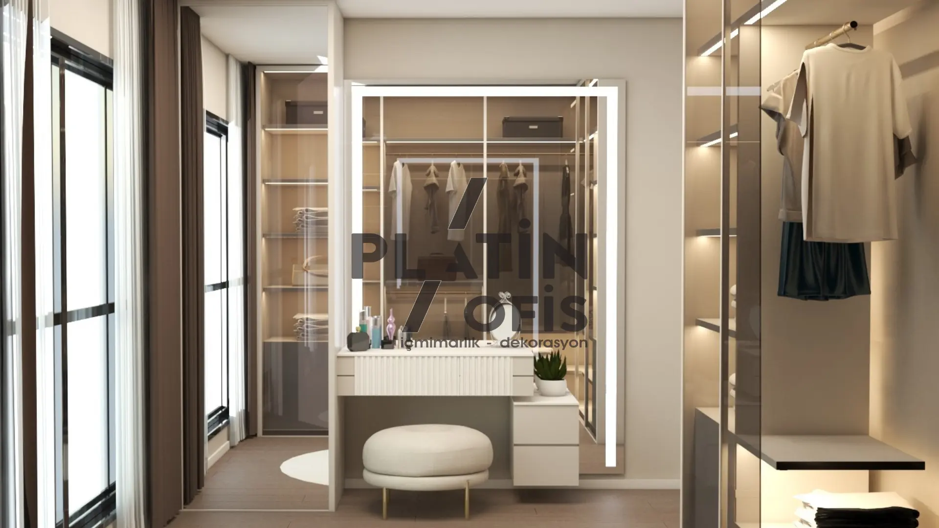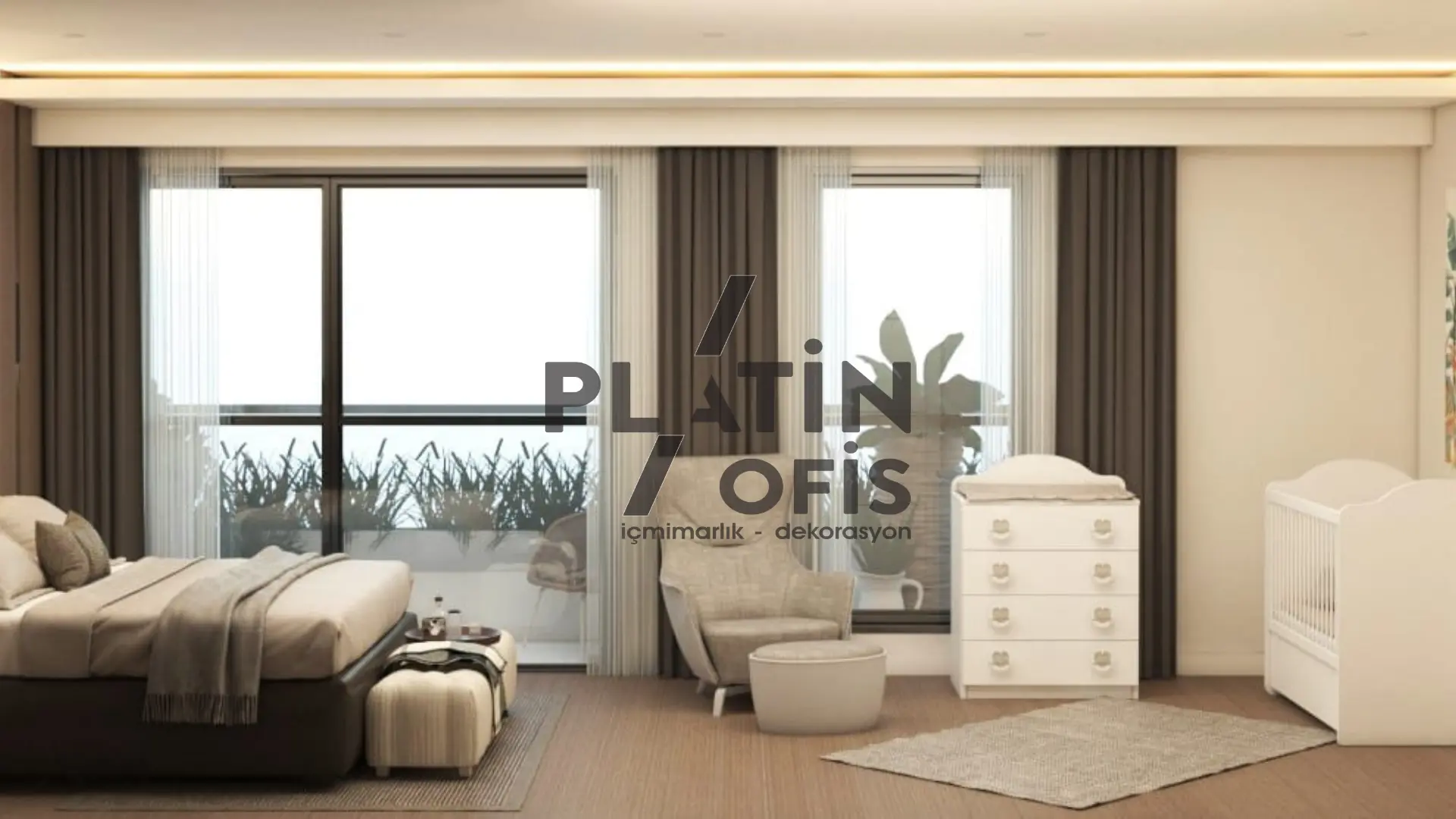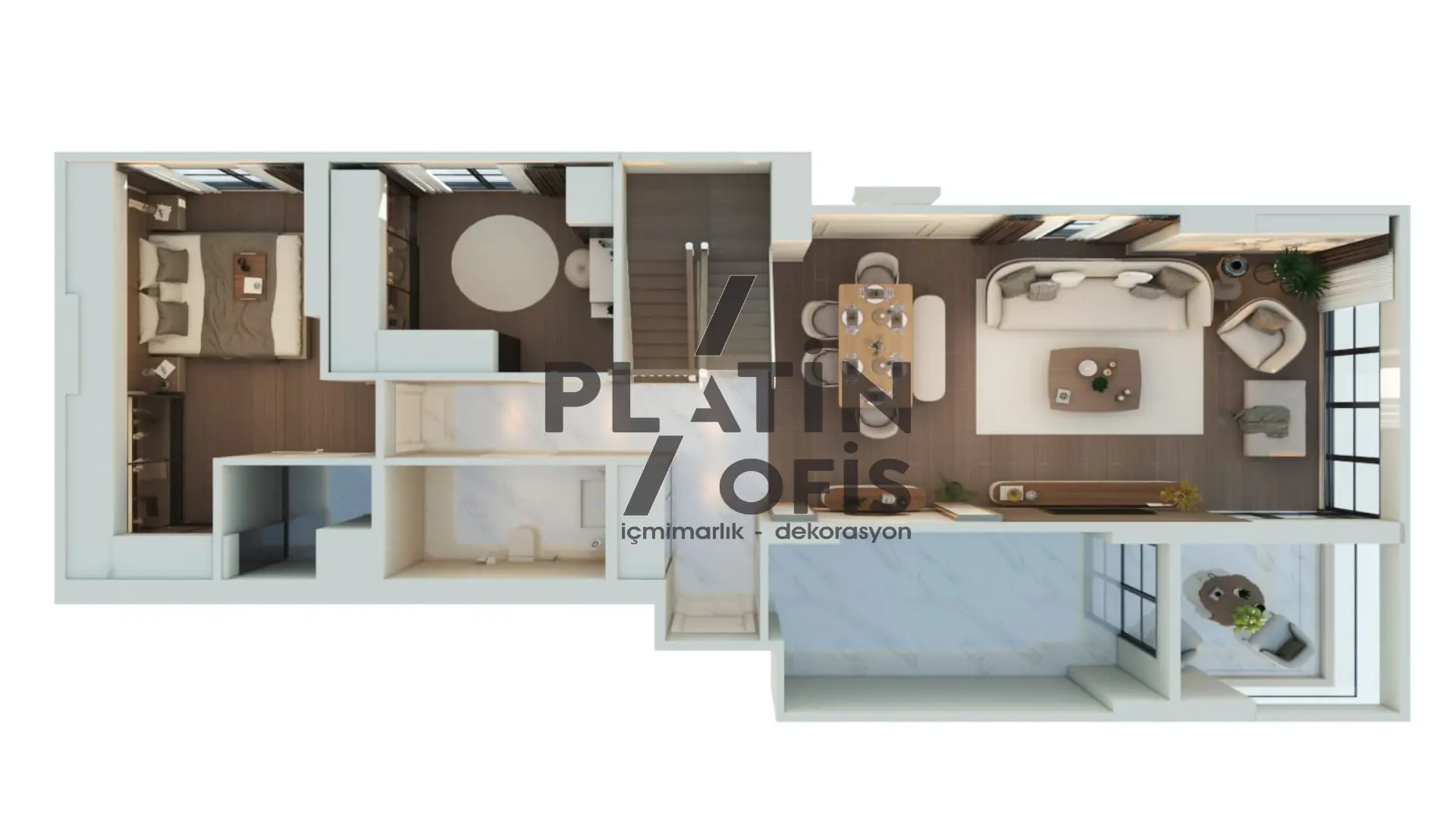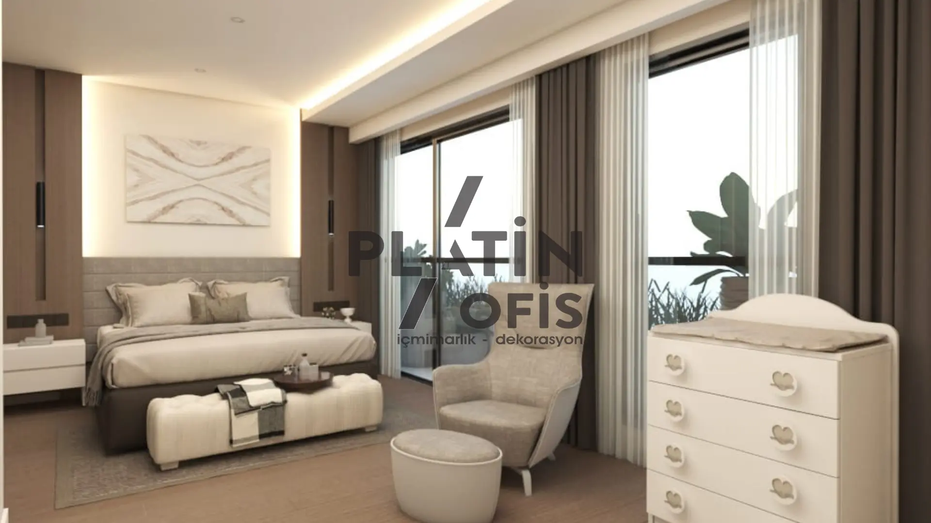 Yunus Kartal Ev iç mimari ve dekorasyon tasarımı projesinde bej, krem ve kahverengi tonları kullanılarak sıcak ve modern bir atmosfer oluşturulmuştur. Ahşap yivli duvar kaplamaları, gizli aydınlatmalı asma tavanlar ve mermer detaylı TV üniteleri ile estetik ve fonksiyonellik bir araya getirilmiştir. LED aydınlatmalı walk-in gardıroplar, geniş balkon alanları ve açık plan yaşam konsepti ile duplex yapı, aileler için konforlu ve prestijli bir yaşam alanına dönüştürülmüştür.